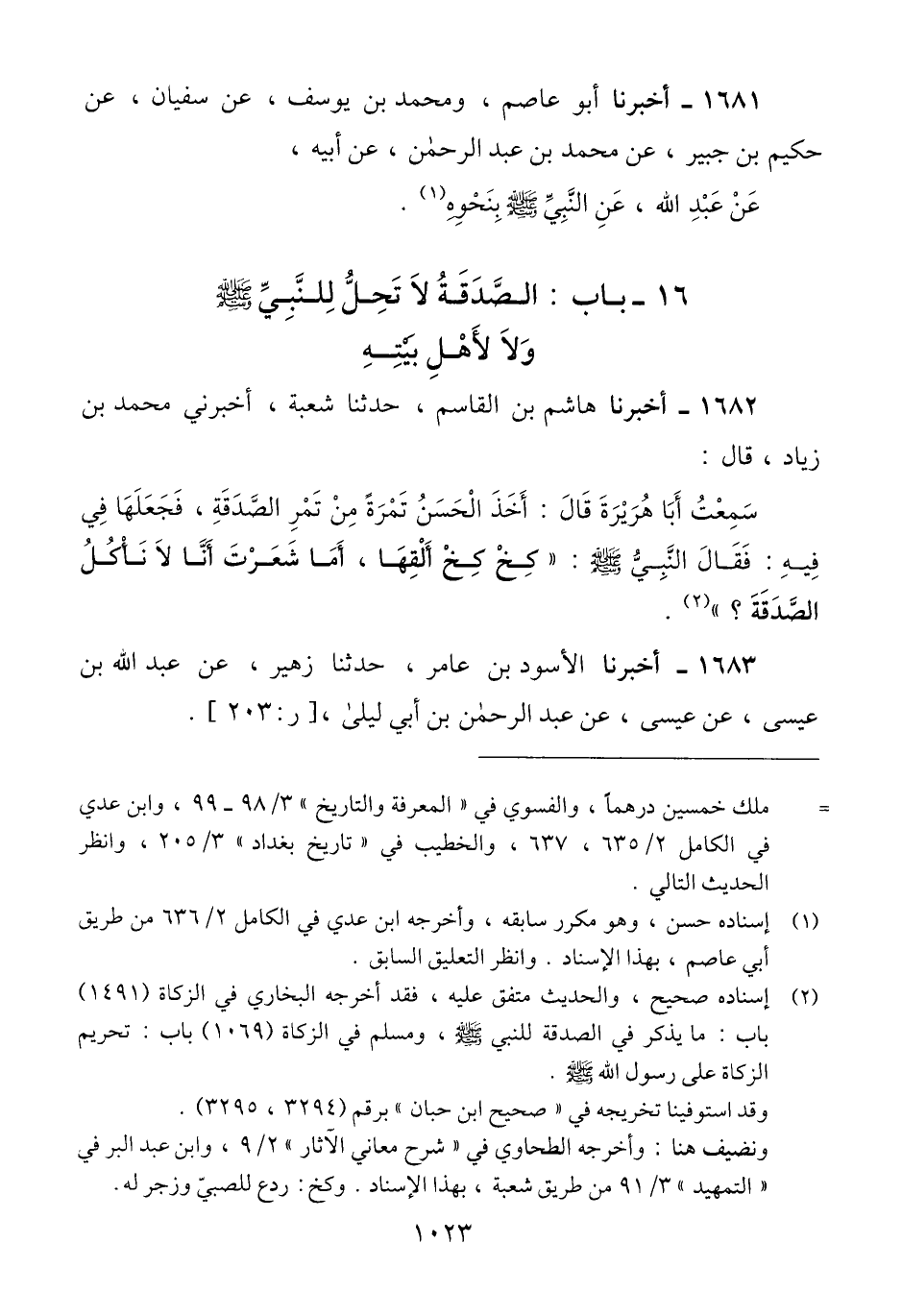1682 - أَخْبَرَنَا هَاشِمُ بْنُ الْقَاسِمِ، حَدَّثَنَا شُعْبَةُ، أَخْبَرَنِي مُحَمَّدُ بْنُ زِيَادٍ قَالَ: سَمِعْتُ أَبَا هُرَيْرَةَ قَالَ: أَخَذَ الْحَسَنُ تَمْرَةً مِنْ تَمْرِ الصَّدَقَةِ، فَجَعَلَهَا فِي فِيهِ، فَقَالَ النَّبِيُّ صَلَّى اللهُ عَلَيْهِ وَسَلَّمَ: «كِخْ كِخْ أَلْقِهَا، أَمَا شَعَرْتَ §أَنَّا لَا نَأْكُلُ الصَّدَقَةَ؟» Qإسناده صحيح