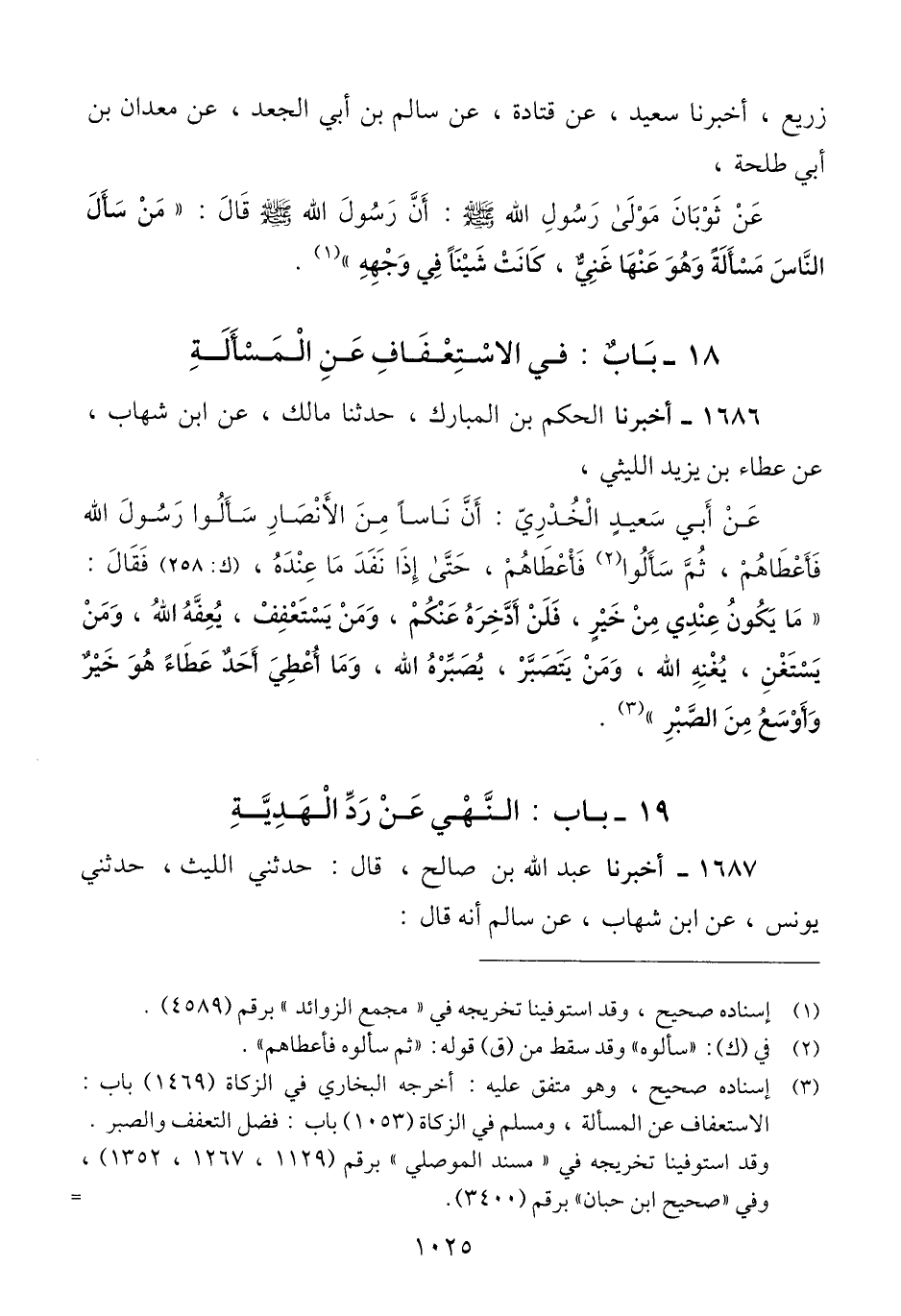 1686 - أَخْبَرَنَا الْحَكَمُ بْنُ الْمُبَارَكِ، حَدَّثَنَا مَالِكٌ، عَنْ ابْنِ شِهَابٍ، عَنْ عَطَاءِ بْنِ يَزِيدَ اللَّيْثِيِّ، عَنْ أَبِي سَعِيدٍ الْخُدْرِيِّ، أَنَّ نَاسًا مِنَ الْأَنْصَارِ سَأَلُوا رَسُولَ اللَّهِ صَلَّى اللهُ عَلَيْهِ وَسَلَّمَ فَأَعْطَاهُمْ، ثُمَّ سَأَلُوا فَأَعْطَاهُمْ، حَتَّى إِذَا نَفِدَ ما عِنْدَهُ فَقَالَ: «§مَا يَكُونُ عِنْدِي مِنْ خَيْرٍ، فَلَنْ أَدَّخِرَهُ عَنْكُمْ، وَمَنْ يَسْتَعْفِفْ يُعِفَّهُ اللَّهُ، وَمَنْ يَسْتَغْنِ يُغْنِهِ اللَّهُ، وَمَنْ يَتَصَبَّرْ يُصَبِّرْهُ اللَّهُ، وَمَا أُعْطِيَ أَحَدٌ عَطَاءً هُوَ خَيْرٌ وَأَوْسَعُ مِنَ الصَّبْرِ» Qإسناده صحيح