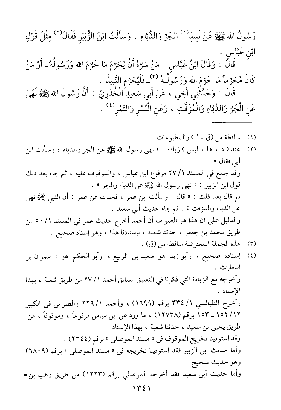 قَالَ: وَحَدَّثَنِي أَخِي عَنْ أَبِي سَعِيدٍ الْخُدْرِيِّ، أَنَّ رَسُولَ اللَّهِ صَلَّى اللهُ عَلَيْهِ وَسَلَّمَ §نَهَى عَنِ الْجَرِّ وَالدُّبَّاءِ وَالْمُزَفَّتِ، وَعَنِ الْبُسْرِ وَالتَّمْرِ