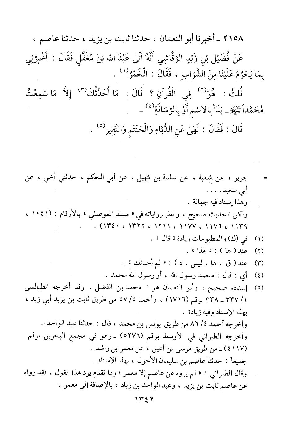 2158 - أَخْبَرَنَا أَبُو النُّعْمَانِ، حَدَّثَنَا ثَابِتُ بْنُ يَزِيدَ، حَدَّثَنَا عَاصِمٌ، عَنْ فُضَيْلِ بْنِ زَيْدٍ الرَّقَاشِيِّ، أَنَّهُ أَتَى عَبْدَ اللَّهِ بْنَ مُغَفَّلٍ، فَقَالَ: أَخْبِرْنِي بِمَا يَحْرُمُ عَلَيْنَا مِنَ الشَّرَابِ. فَقَالَ: الْخَمْرُ. قُلْتُ: هُوَ فِي الْقُرْآنِ. قَالَ: مَا أُحَدِّثُكَ إِلَّا مَا سَمِعْتُ مُحَمَّدًا صَلَّى اللهُ عَلَيْهِ وَسَلَّمَ بَدَأَ بِالِاسْمِ، أَوْ بِالرِّسَالَةِ قَالَ: فَقَالَ: «§نَهَى عَنِ الدُّبَّاءِ وَالْحَنْتَمِ وَالنَّقِيرِ» Qإسناده صحيح