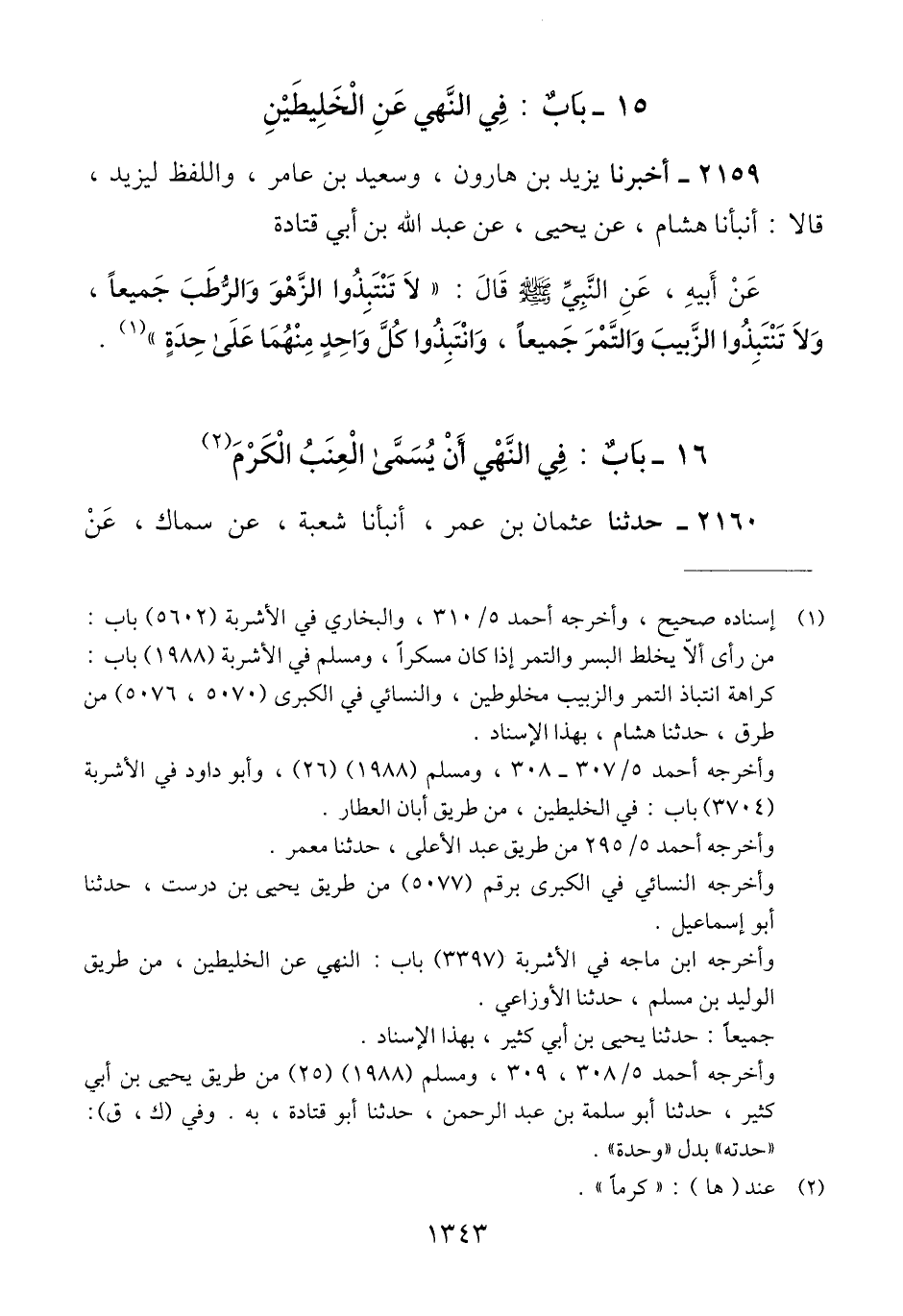 2159 - أَخْبَرَنَا يَزِيدُ بْنُ هَارُونَ، وَسَعِيدُ بْنُ عَامِرٍ وَاللَّفْظُ لِيَزِيدَ قَالَا: أَنْبَأَنَا هِشَامٌ، عَنْ يَحْيَى، عَنْ عَبْدِ اللَّهِ بْنِ أَبِي قَتَادَةَ، عَنْ أَبِيهِ، عَنِ النَّبِيِّ صَلَّى اللهُ عَلَيْهِ وَسَلَّمَ قَالَ «§لَا تَنْتَبِذُوا الزَّهْوَ وَالرُّطَبَ جَمِيعًا، وَلَا تَنْتَبِذُوا الزَّبِيبَ، وَالتَّمْرَ جَمِيعًا. وَانْتَبِذُوا كُلَّ وَاحِدٍ مِنْهُمَا عَلَى حِدَتِهِ» Qإسناده صحيح