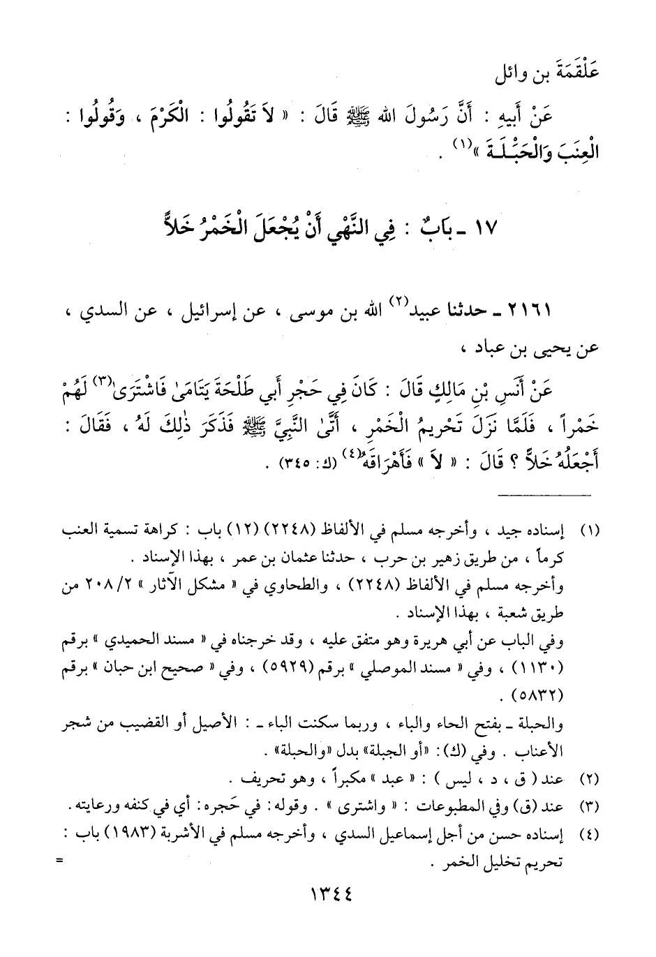2161 - حَدَّثَنَا عُبَيْدُ اللَّهِ بْنُ مُوسَى، عَنْ إِسْرَائِيلَ، عَنْ السُّدِّيِّ، عَنْ يَحْيَى بْنِ عَبَّادٍ، عَنْ أَنَسِ بْنِ مَالِكٍ، قَالَ كَانَ فِي حِجْرِ أَبِي طَلْحَةَ يَتَامَى. فَاشْتَرَى لَهُمْ خَمْرًا، §فَلَمَّا نَزَلَ تَحْرِيمُ الْخَمْرِ أَتَى النَّبِيَّ صَلَّى اللهُ عَلَيْهِ وَسَلَّمَ فَذَكَرَ ذَلِكَ لَهُ فَقَالَ: «أَجْعَلُهُ خَلًّا» قَالَ: لَا فَأَهْرَاقَهُQإسناده حسن من أجل إسماعيل السدي