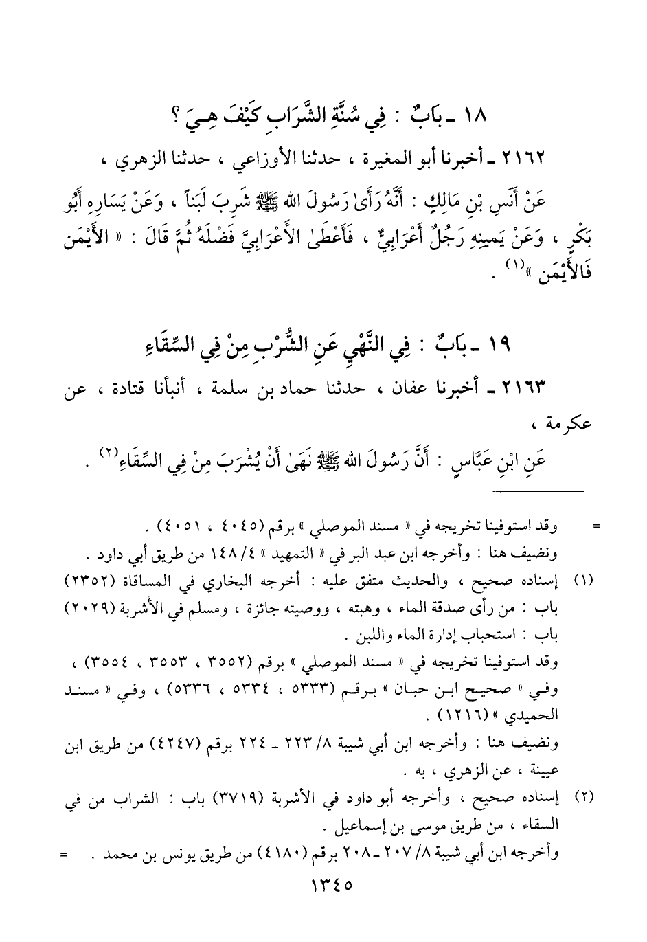 2162 - أَخْبَرَنَا أَبُو الْمُغِيرَةِ، حَدَّثَنَا الْأَوْزَاعِيُّ، حَدَّثَنَا الزُّهْرِيُّ، عَنْ أَنَسِ بْنِ مَالِكٍ، §أَنَّهُ رَأَى رَسُولَ اللَّهِ صَلَّى اللهُ عَلَيْهِ وَسَلَّمَ شَرِبَ لَبَنًا. وَعَنْ يَسَارِهِ أَبُو بَكْرٍ، وَعَنْ يَمِينِهِ رَجُلٌ أَعْرَابِيٌّ، فَأَعْطَى الْأَعْرَابِيَّ فَضْلَهُ. ثُمَّ قَالَ: الْأَيْمَنَ فَالْأَيْمَنَQإسناده صحيح
