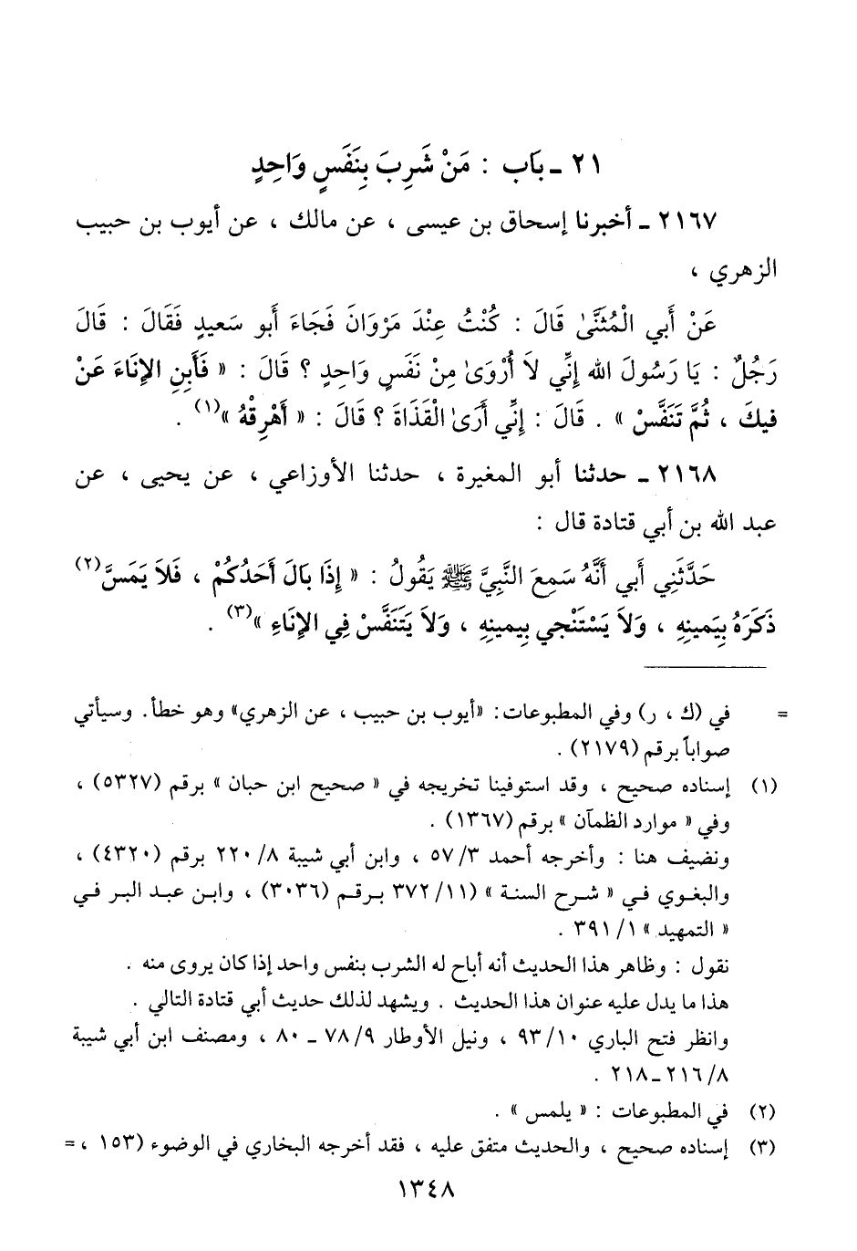 2167 - أَخْبَرَنَا إِسْحَاقُ بْنُ عِيسَى، عَنْ مَالِكٍ، عَنْ أَيُّوبَ بْنِ حَبِيبٍ، عَنْ الزُّهْرِيِّ، عَنْ أَبِي الْمُثَنَّى، قَالَ كُنْتُ عِنْدَ مَرْوَانَ فَجَاءَ أَبُو سَعِيدٍ فَقَالَ: قَالَ رَجُلٌ: يَا رَسُولَ اللَّهِ إِنِّي لَا أَرْوَى مِنْ نَفَسٍ وَاحِدٍ. قَالَ: «§فَأَبِنِ الْإِنَاءَ عَنْ فِيكَ ثُمَّ تَنَفَّسْ» قَالَ: إِنِّي أَرَى الْقَذَاةَ. قَالَ: «أَهْرِقْهُ» Qإسناده صحيح