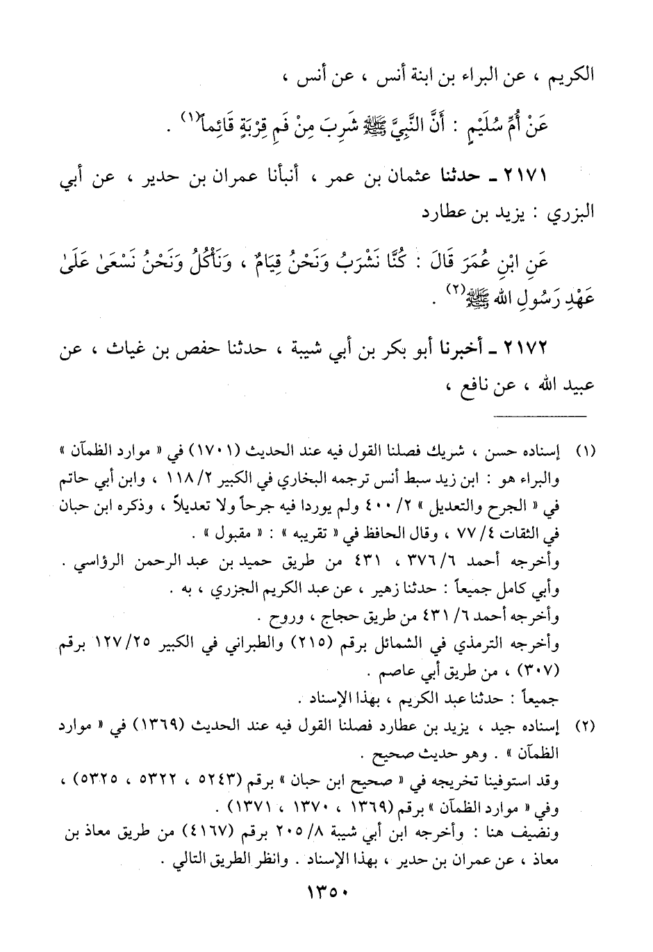 2171 - حَدَّثَنَا عُثْمَانُ بْنُ عُمَرَ، أَنْبَأَنَا عِمْرَانُ بْنُ حُدَيْرٍ، عَنْ أَبِي الْبَزَرِيِّ يَزِيدَ بْنِ عُطَارِدَ، عَنْ ابْنِ عُمَرَ، قَالَ: «كُنَّا §نَشْرَبُ وَنَحْنُ قِيَامٌ وَنَأْكُلُ، وَنَحْنُ نَسْعَى عَلَى عَهْدِ رَسُولِ اللَّهِ صَلَّى اللهُ عَلَيْهِ وَسَلَّمَ» Qإسناده جيد