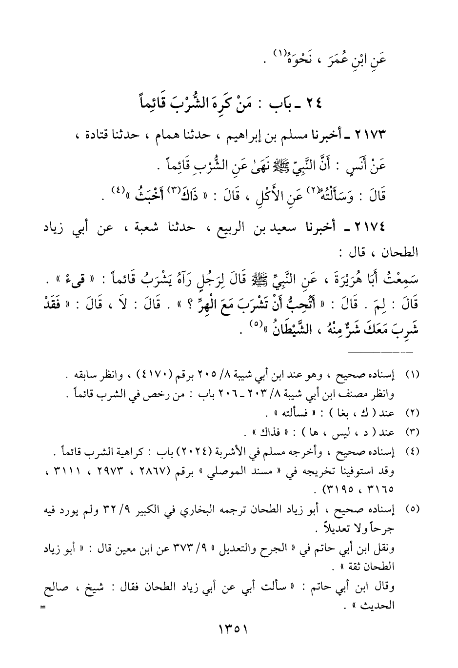 2174 - أَخْبَرَنَا سَعِيدُ بْنُ الرَّبِيعِ، حَدَّثَنَا شُعْبَةُ، عَنْ أَبِي زِيَادٍ الطَّحَّانِ، قَالَ: سَمِعْتُ أَبَا هُرَيْرَةَ، عَنِ النَّبِيِّ صَلَّى اللهُ عَلَيْهِ وَسَلَّمَ قَالَ: لِرَجُلٍ رَآهُ يَشْرَبُ قَائِمًا قِئْ قَالَ: لِمَ. قَالَ: «§أَتُحِبُّ أَنْ تَشْرَبَ مَعَ الْهِرِّ» قَالَ: لَا. قَالَ: «فَقَدْ شَرِبَ مَعَكَ شَرٌّ مِنْهُ الشَّيْطَانُ» Qإسناده صحيح