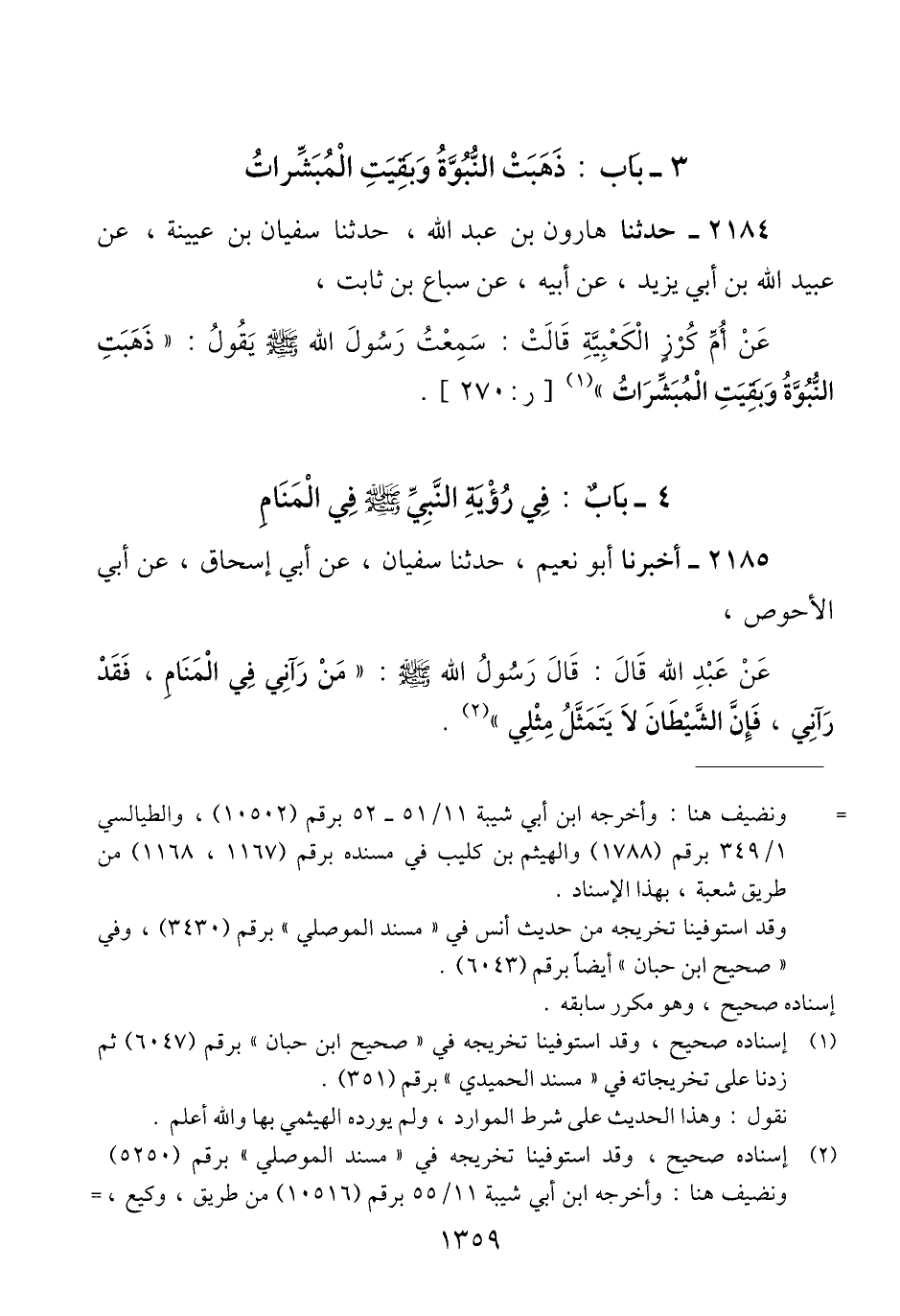 2184 - حَدَّثَنَا هَارُونُ بْنُ عَبْدِ اللَّهِ، حَدَّثَنَا سُفْيَانُ بْنُ عُيَيْنَةَ، عَنْ عُبَيْدِ اللَّهِ بْنِ أَبِي يَزِيدَ، عَنْ أَبِيهِ، عَنْ سِبَاعِ بْنِ ثَابِتٍ، عَنْ أُمِّ كُرْزٍ الْكَعْبِيَّةِ، قَالَتْ: سَمِعْتُ رَسُولَ اللَّهِ صَلَّى اللهُ عَلَيْهِ وَسَلَّمَ يَقُولُ: «§ذَهَبَتِ النُّبُوَّةُ وَبَقِيَتِ الْمُبَشِّرَاتُ» Qإسناده صحيح