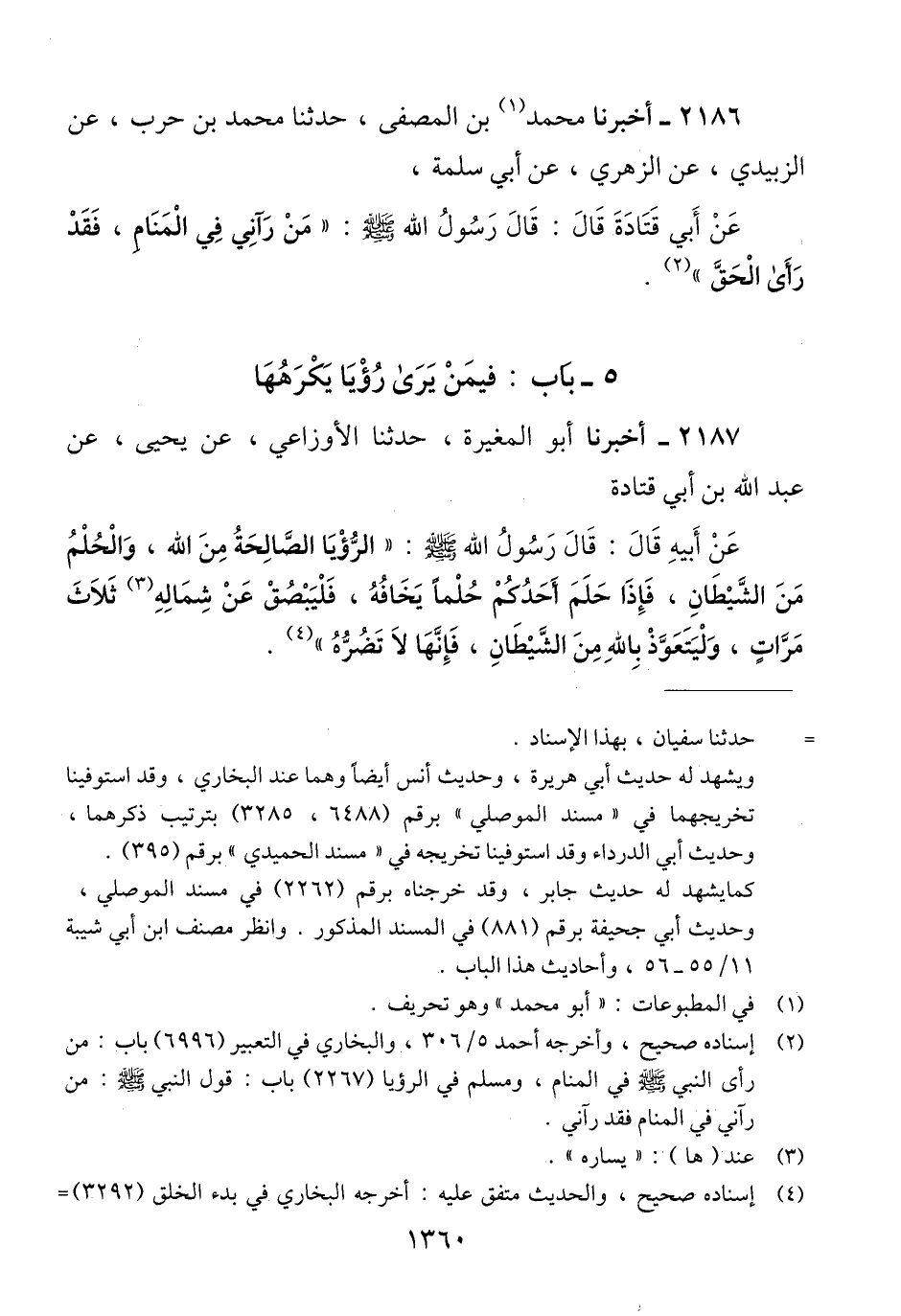 2186 - أَخْبَرَنَا مُحَمَّدُ بْنُ الْمُصَفَّى، حَدَّثَنَا مُحَمَّدُ بْنُ حَرْبٍ، عَنْ الزُّبَيْدِيِّ، عَنْ الزُّهْرِيِّ، عَنْ أَبِي سَلَمَةَ، عَنْ أَبِي قَتَادَةَ، قَالَ: قَالَ رَسُولُ اللَّهِ صَلَّى اللهُ عَلَيْهِ وَسَلَّمَ: «§مَنْ رَآنِي فِي الْمَنَامِ فَقَدْ رَأَى الْحَقَّ» Qإسناده صحيح