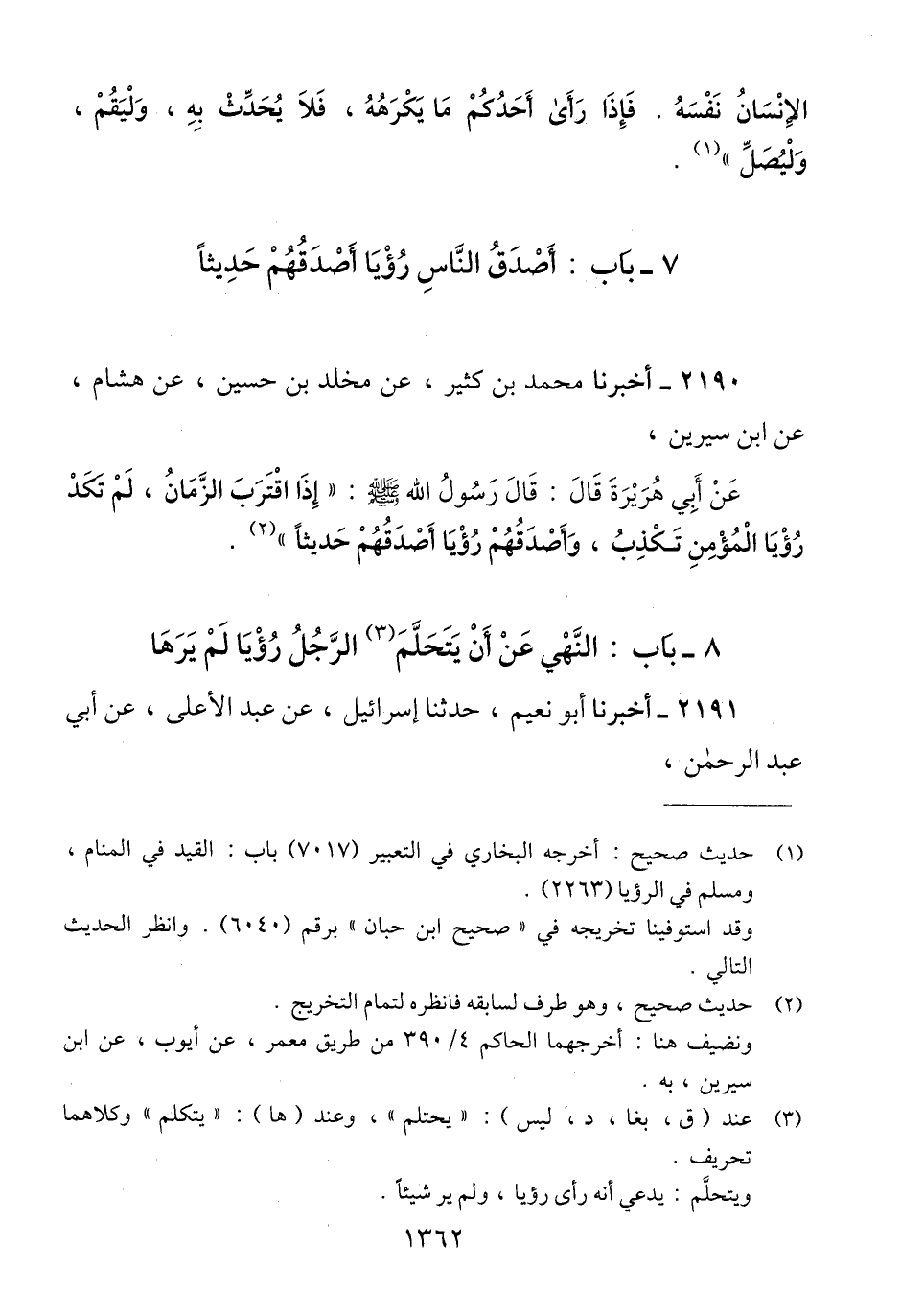 2190 - أَخْبَرَنَا مُحَمَّدُ بْنُ كَثِيرٍ، عَنْ مَخْلَدِ بْنِ حُسَيْنٍ، عَنْ هِشَامٍ، عَنْ ابْنِ سِيرِينَ، عَنْ أَبِي هُرَيْرَةَ، قَالَ: قَالَ رَسُولُ اللَّهِ صَلَّى اللهُ عَلَيْهِ وَسَلَّمَ: «§إِذَا اقْتَرَبَ الزَّمَانُ، لَمْ تَكَدْ رُؤْيَا الْمُؤْمِنِ تَكْذِبُ، وَأَصْدَقُهُمْ رُؤْيَا أَصْدَقُهُمْ حَدِيثًا» Qإسناده صحيح