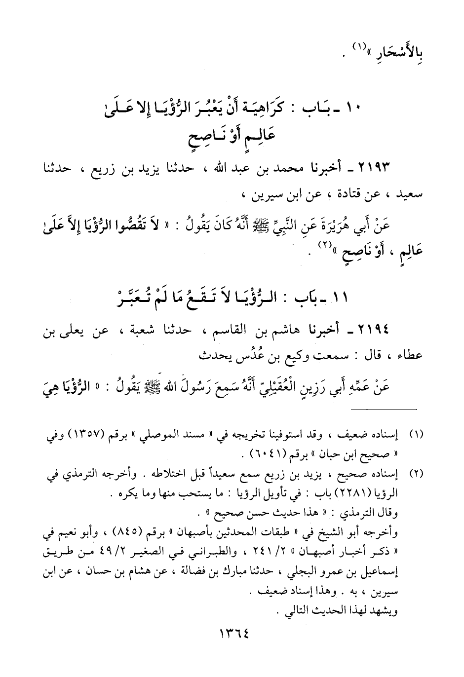 2193 - أَخْبَرَنَا مُحَمَّدُ بْنُ عَبْدِ اللَّهِ، حَدَّثَنَا يَزِيدُ بْنُ زُرَيْعٍ، حَدَّثَنَا سَعِيدٌ، عَنْ قَتَادَةَ، عَنْ ابْنِ سِيرِينَ، عَنْ أَبِي هُرَيْرَةَ، عَنِ النَّبِيِّ صَلَّى اللهُ عَلَيْهِ وَسَلَّمَ أَنَّهُ كَانَ يَقُولُ: «§لَا تَقُصُّوا الرُّؤْيَا إِلَّا عَلَى عَالِمٍ أَوْ نَاصِحٍ» Qإسناده صحيح