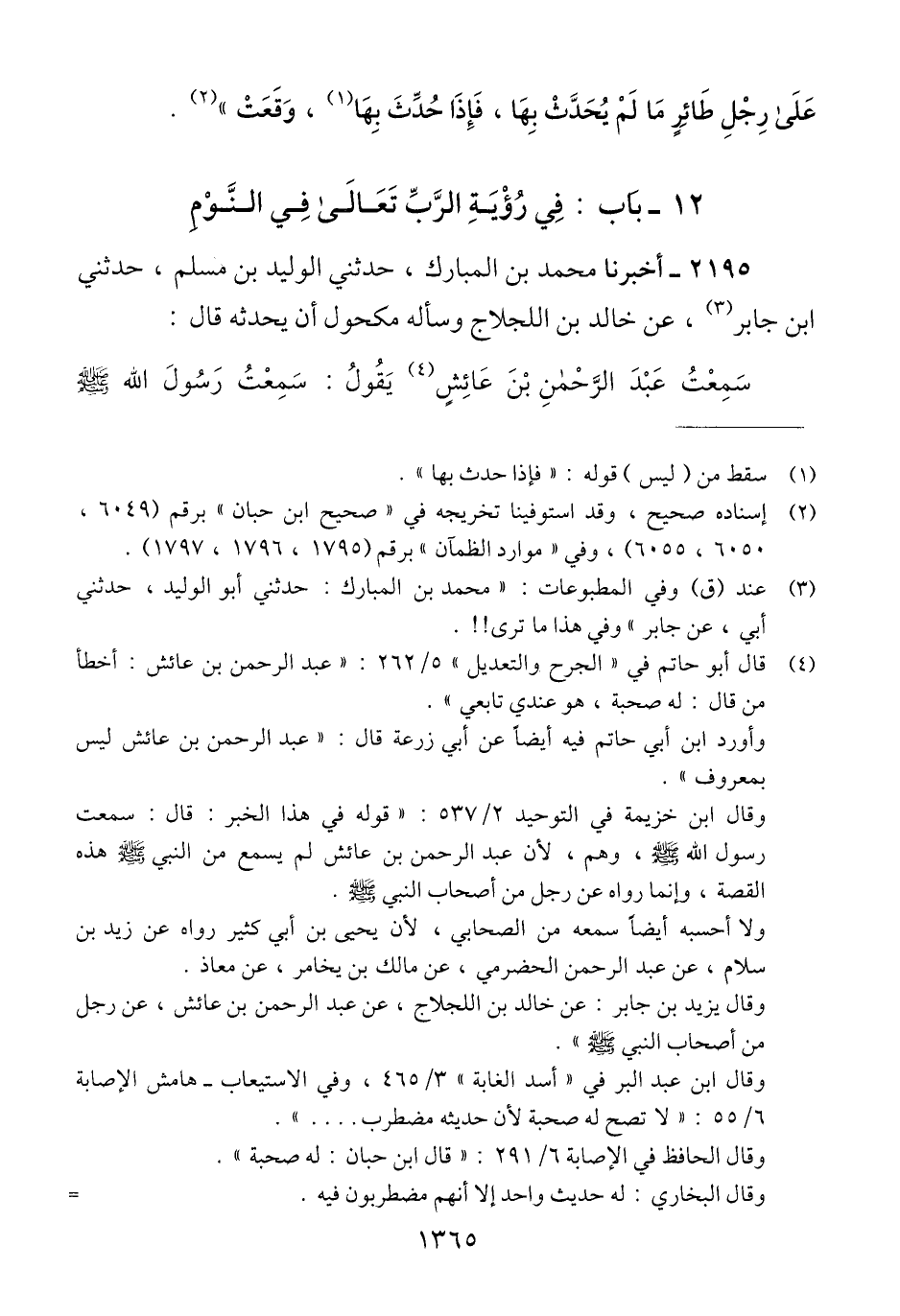 2195 - أَخْبَرَنَا مُحَمَّدُ بْنُ الْمُبَارَكِ، حَدَّثَنِي الْوَلِيدُ بْنُ مُسْلِمٍ، حَدَّثَنِي ابْنُ جَابِرٍ، عَنْ خَالِدِ بْنِ اللَّجْلَاجِ، وَسَأَلَهُ، مَكْحُولٌ أَنْ يُحَدِّثَهُ، قَالَ: سَمِعْتُ عَبْدَ الرَّحْمَنِ بْنَ عَائِشٍ، يَقُولُ: سَمِعْتُ رَسُولَ اللَّهِ صَلَّى اللهُ عَلَيْهِ وَسَلَّمَ -[1366]- يَقُولُ: «§رَأَيْتُ رَبِّي فِي أَحْسَنِ صُورَةٍ» قَالَ: فِيمَ يَخْتَصِمُ الْمَلَأُ الْأَعْلَى؟ فَقُلْتُ: «أَنْتَ أَعْلَمُ يَا رَبِّ»، قَالَ: " فَوَضَعَ كَفَّهُ بَيْنَ كَتِفَيَّ فَوَجَدْتُ بَرْدَهَا بَيْنَ ثَدْيَيَّ، -[1367]- فَعَلِمْتُ مَا فِي السَّمَوَاتِ وَالْأَرْضِ، وَتَلَا {وَكَذَلِكَ نُرِي إِبْرَاهِيمَ مَلَكُوتَ السَّمَوَاتِ وَالْأَرْضِ وَلِيَكُونَ مِنَ الْمُوقِنِينَ} Qهذا من أحاديث الصفات التي علينا أن نؤمن بها ونجريها على ظاهرها من غير تمثيل أو تشبيه أو تأويل. إسناده صحيح إذا ثبتت صحبة عبد الرحمن بن عائش