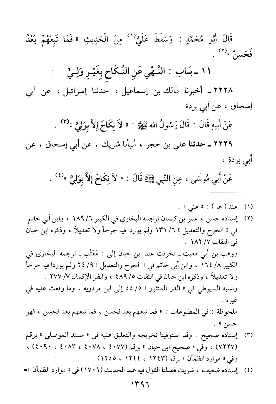 2228 - أَخْبَرَنَا مَالِكُ بْنُ إِسْمَاعِيلَ، حَدَّثَنَا إِسْرَائِيلُ، عَنْ أَبِي إِسْحَاقَ، عَنْ أَبِي بُرْدَةَ، عَنْ أَبِيهِ، قَالَ: قَالَ رَسُولُ اللَّهِ صَلَّى اللهُ عَلَيْهِ وَسَلَّمَ: «§لَا نِكَاحَ إِلَّا بِوَلِيٍّ» Qإسناده صحيح