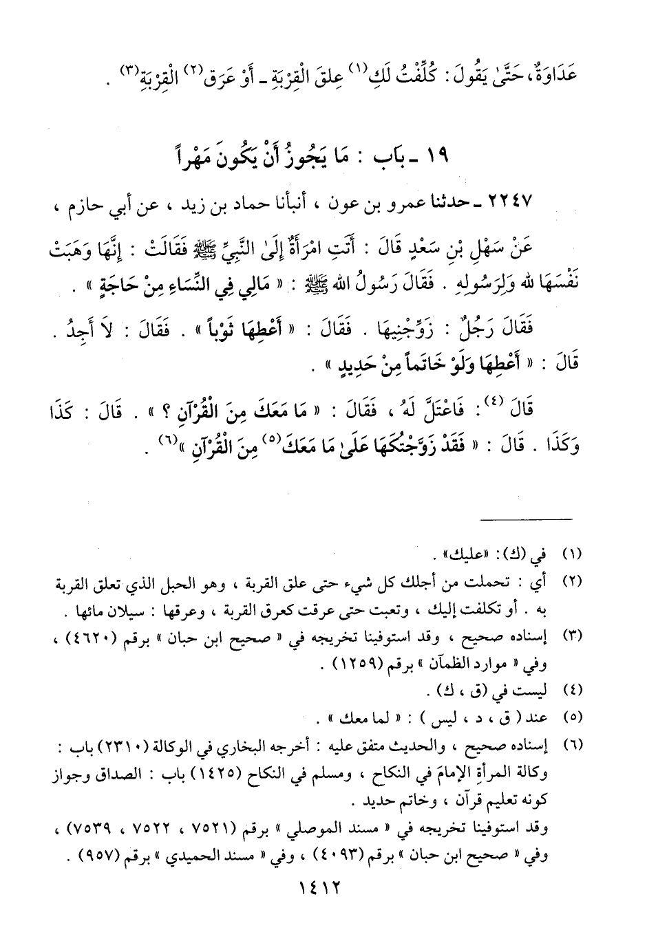 2247 - حَدَّثَنَا عَمْرُو بْنُ عَوْنٍ، أَنْبَأَنَا حَمَّادُ بْنُ زَيْدٍ، عَنْ أَبِي حَازِمٍ، عَنْ سَهْلِ بْنِ سَعْدٍ، قَالَ: أَتَتِ امْرَأَةٌ إِلَى النَّبِيِّ صَلَّى اللهُ عَلَيْهِ وَسَلَّمَ فَقَالَتْ: إِنَّهَا وَهَبَتْ نَفْسَهَا لِلَّهِ وَلِرَسُولِهِ، فَقَالَ رَسُولُ اللَّهِ صَلَّى اللهُ عَلَيْهِ وَسَلَّمَ: «§مَا لِي فِي النِّسَاءِ مِنْ حَاجَةٍ» فَقَالَ رَجُلٌ: زَوِّجْنِيهَا، فَقَالَ: «أَعْطِهَا ثَوْبًا» فَقَالَ: لَا أَجِدُ، قَالَ: «أَعْطِهَا وَلَوْ خَاتَمًا مِنْ حَدِيدٍ، قَالَ فَاعْتَلَّ لَهُ» فَقَالَ: «مَا مَعَكَ مِنَ الْقُرْآنِ» قَالَ: كَذَا وَكَذَا، قَالَ: «فَقَدْ زَوَّجْتُكَهَا عَلَى مَا مَعَكَ مِنَ الْقُرْآنِ» Qإسناده صحيح والحديث متفق عليه