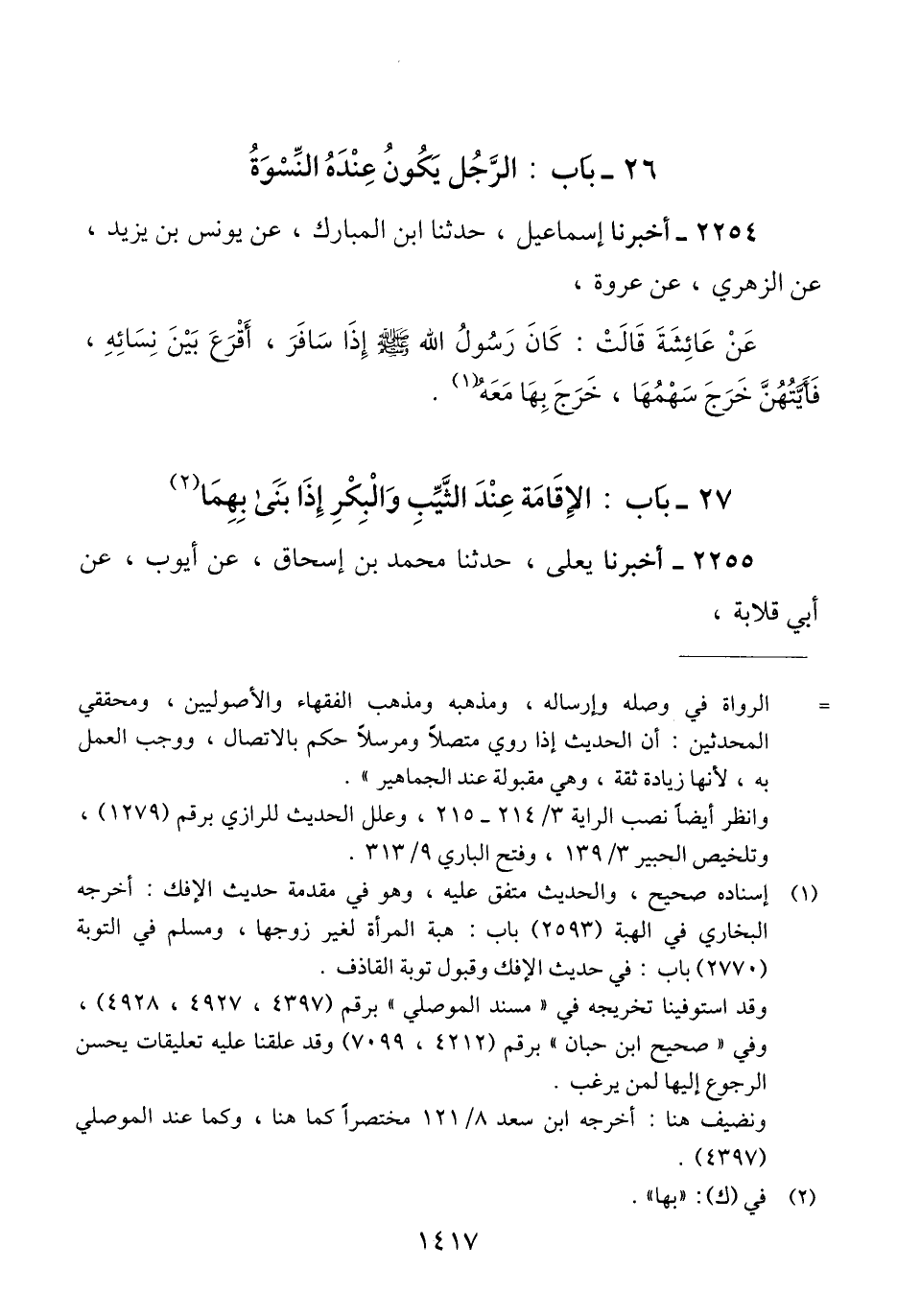 2254 - أَخْبَرَنَا إِسْمَاعِيلُ، حَدَّثَنَا ابْنُ الْمُبَارَكِ، عَنْ يُونُسَ بْنِ يَزِيدَ، عَنْ الزُّهْرِيِّ، عَنْ عُرْوَةَ، عَنْ عَائِشَةَ، قَالَتْ: كَانَ رَسُولُ اللَّهِ صَلَّى اللهُ عَلَيْهِ وَسَلَّمَ «§إِذَا سَافَرَ أَقْرَعَ بَيْنَ نِسَائِهِ فَأَيَّتُهُنَّ، خَرَجَ سَهْمُهَا خَرَجَ بِهَا مَعَهُ» Qإسناده صحيح والحديث متفق عليه