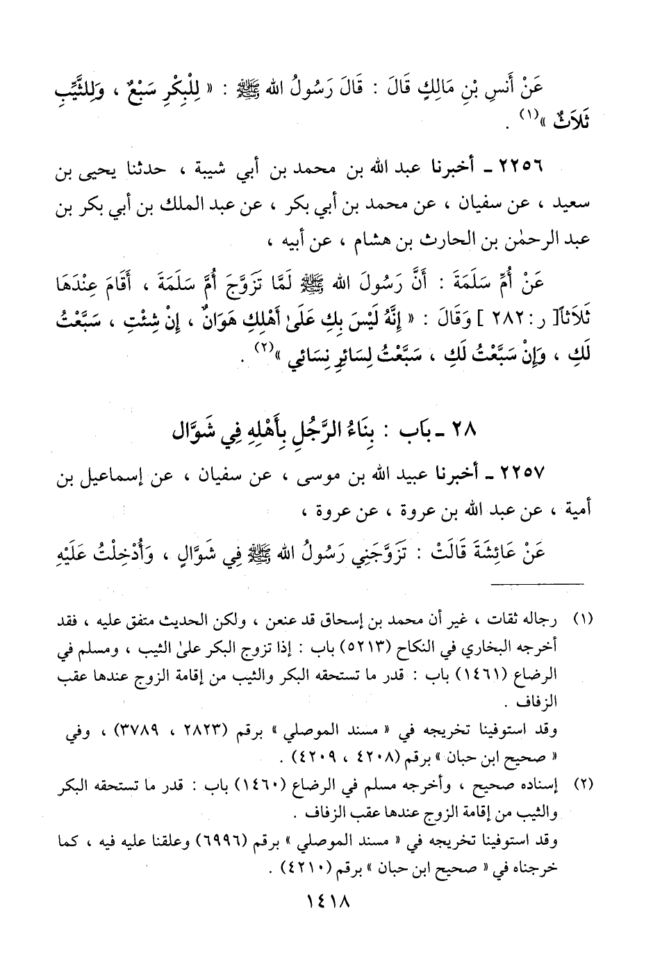 2256 - أَخْبَرَنَا عَبْدُ اللَّهِ بْنُ مُحَمَّدِ بْنِ أَبِي شَيْبَةَ، حَدَّثَنَا يَحْيَى بْنُ سَعِيدٍ، عَنْ سُفْيَانَ، عَنْ مُحَمَّدِ بْنِ أَبِي بَكْرٍ، عَنْ عَبْدِ الْمَلِكِ بْنِ أَبِي بَكْرِ بْنِ عَبْدِ الرَّحْمَنِ بْنِ الْحَارِثِ بْنِ هِشَامٍ، عَنْ أَبِيهِ، عَنْ أُمِّ سَلَمَةَ، أَنَّ رَسُولَ اللَّهِ صَلَّى اللهُ عَلَيْهِ وَسَلَّمَ لَمَّا تَزَوَّجَ أُمَّ سَلَمَةَ، أَقَامَ عِنْدَهَا ثَلَاثًا، وَقَالَ: «§إِنَّهُ لَيْسَ بِكِ عَلَى أَهْلِكِ هَوَانٌ، إِنْ شِئْتِ سَبَّعْتُ لَكِ، وَإِنْ سَبَّعْتُ لَكِ، سَبَّعْتُ لِسَائِرِ نِسَائِي» Qإسناده صحيح