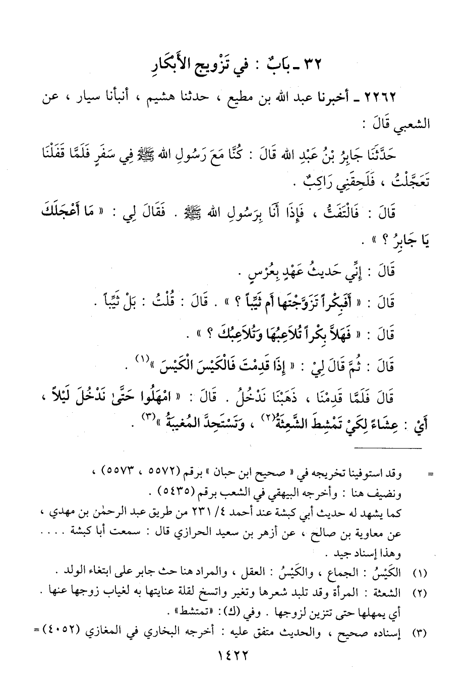 2262 - أَخْبَرَنَا عَبْدُ اللَّهِ بْنُ مُطِيعٍ، حَدَّثَنَا هُشَيْمٌ، أََنْبَأنَا سَيَّارٌ، عَنْ الشَّعْبِيِّ، حَدَّثَنَا جَابِرُ بْنُ عَبْدِ اللَّهِ، قَالَ: كُنَّا مَعَ رَسُولِ اللَّهِ صَلَّى اللهُ عَلَيْهِ وَسَلَّمَ فِي سَفَرٍ، فَلَمَّا قَفَلْنَا: تَعَجَّلْتُ، فَلَحِقَنِي رَاكِبٌ، قَالَ: فَالْتَفَتُّ، فَإِذَا أَنَا بِرَسُولِ اللَّهِ صَلَّى اللهُ عَلَيْهِ وَسَلَّمَ فَقَالَ لِي: «§مَا أَعْجَلَكَ يَا جَابِرُ؟». قَالَ: إِنِّي حَدِيثُ عَهْدٍ بِعُرْسٍ، قَالَ: «أَفَبِكْرًا تَزَوَّجْتَهَا أَمْ ثَيِّبًا» قَالَ: قُلْتُ: بَلْ ثَيِّبًا. قَالَ: «فَهَلَّا بِكْرًا تُلَاعِبُهَا، وَتُلَاعِبُكَ» قَالَ: ثُمَّ قَالَ لِي: «إِذَا قَدِمْتَ فَالْكَيْسَ الْكَيْسَ» قَالَ: فَلَمَّا قَدِمْنَا، ذَهَبْنَا نَدْخُلُ. قَالَ: «أَمْهِلُوا حَتَّى نَدْخُلَ لَيْلًا، أَيْ عِشَاءً لِكَيْ تَمْتَشِطَ الشَّعِثَةُ، وَتَسْتَحِدَّ الْمُغِيبَةُ» Qإسناده صحيح والحديث متفق عليه