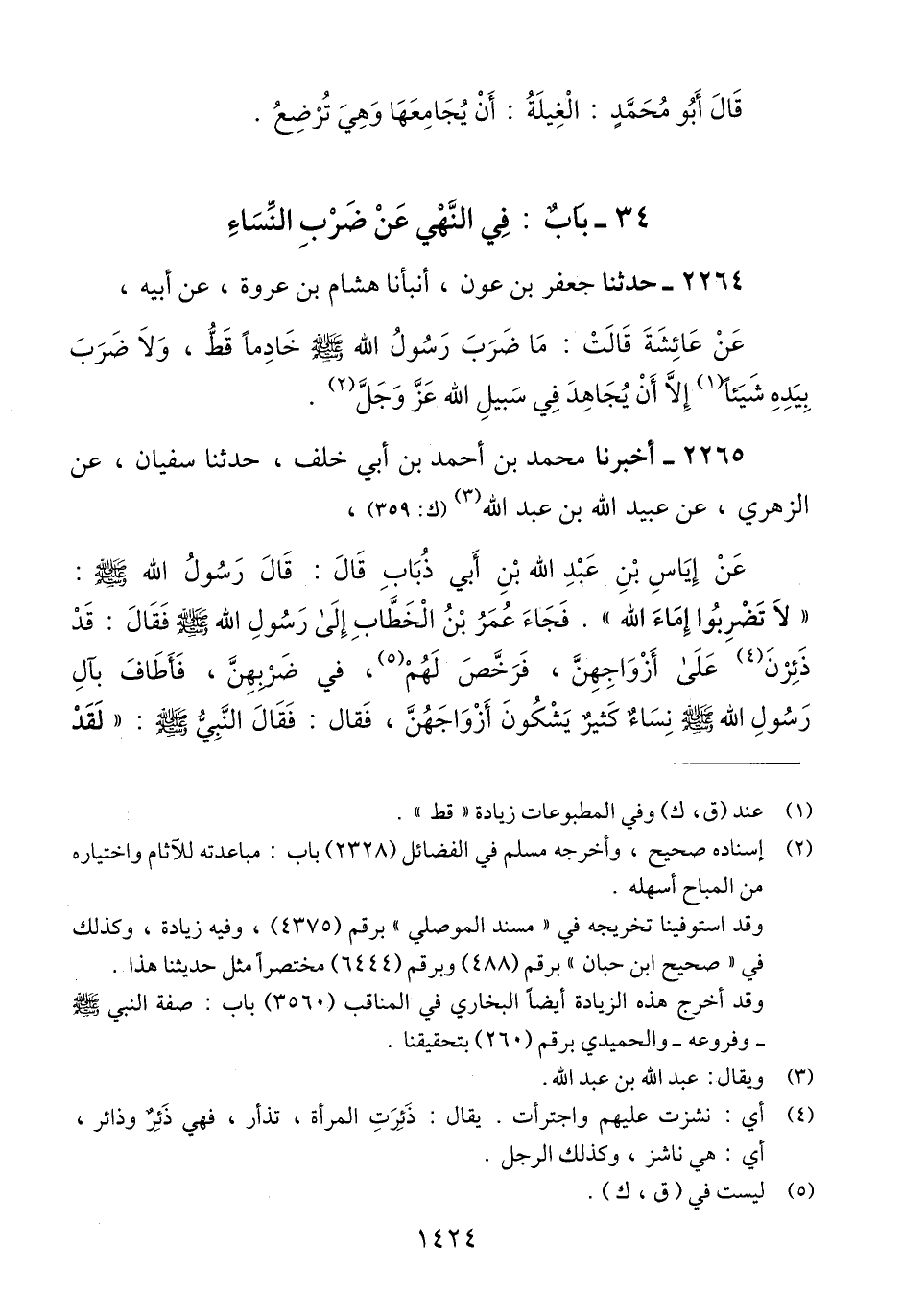2265 - أَخْبَرَنَا مُحَمَّدُ بْنُ أَحْمَدَ بْنِ أَبِي خَلَفٍ، حَدَّثَنَا سُفْيَانُ، عَنْ الزُّهْرِيِّ، عَنْ عُبَيْدِ اللَّهِ بْنِ عَبْدِ اللَّهِ، عَنْ إِيَاسِ بْنِ عَبْدِ اللَّهِ بْنِ أَبِي ذُبَابٍ، قَالَ: قَالَ رَسُولُ اللَّهِ صَلَّى اللهُ عَلَيْهِ وَسَلَّمَ: «§لَا تَضْرِبُوا إِمَاءَ اللَّهِ» فَجَاءَ عُمَرُ بْنُ الْخَطَّابِ إِلَى رَسُولِ اللَّهِ صَلَّى اللهُ عَلَيْهِ وَسَلَّمَ فَقَالَ: قَدْ ذَئِرْنَ عَلَى أَزْوَاجِهِنَّ، فَرَخَّصَ لَهُمْ فِي ضَرْبِهِنَّ، فَأَطَافَ بِآلِ رَسُولِ اللَّهِ صَلَّى اللهُ عَلَيْهِ وَسَلَّمَ نِسَاءٌ كَثِيرٌ يَشْكُونَ أَزْوَاجَهُنَّ، فَقَالَ النَّبِيُّ صَلَّى اللهُ عَلَيْهِ وَسَلَّمَ: «لَقَدْ -[1425]- طَافَ بِآلِ مُحَمَّدٍ نِسَاءٌ كَثِيرٌ، يَشْكُونَ أَزْوَاجَهُنَّ لَيْسَ أُولَئِكَ بِخِيَارِكُمْ» Qإسناده صحيح
