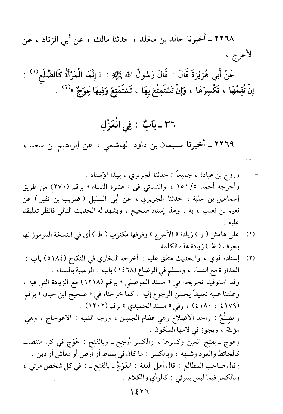 2268 - أَخْبَرَنَا خَالِدُ بْنُ مَخْلَدٍ، حَدَّثَنَا مَالِكٌ، عَنْ أَبِي الزِّنَادِ، عَنْ الْأَعْرَجِ، عَنْ أَبِي هُرَيْرَةَ، قَالَ: قَالَ رَسُولُ اللَّهِ صَلَّى اللهُ عَلَيْهِ وَسَلَّمَ: «إِنَّمَا §الْمَرْأَةُ كَالضِّلَعِ، إِنْ تُقِمْهَا، تَكْسِرْهَا، وَإِنْ تَسْتَمْتِعْ بها، تَسْتَمْتِعْ وَفِيهَا عِوَجٌ» Qإسناده قوي والحديث متفق عليه