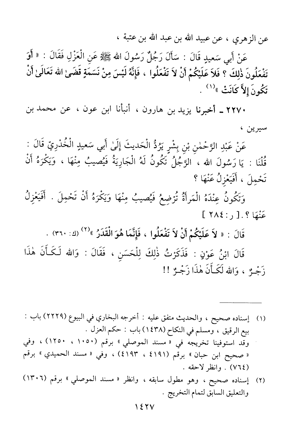 2270 - أَخْبَرَنَا يَزِيدُ بْنُ هَارُونَ، أَنْبَأََنَا ابْنُ عَوْنٍ، عَنْ مُحَمَّدِ بْنِ سِيرِينَ، عَنْ عَبْدِ الرَّحْمَنِ بْنِ بِشْرٍ، يَرُدُّ الْحَدِيثَ إِلَى أَبِي سَعِيدٍ الْخُدْرِيِّ قَالَ: قُلْنَا يَا رَسُولَ اللَّهِ §الرَّجُلُ تَكُونُ لَهُ الْجَارِيَةُ فَيُصِيبُ مِنْهَا، وَيَكْرَهُ أَنْ تَحْمِلَ، أَفَيَعْزِلُ عَنْهَا؟ وَتَكُونُ عِنْدَهُ الْمَرْأَةُ تُرْضِعُ، فَيُصِيبُ مِنْهَا، وَيَكْرَهُ أَنْ تَحْمِلَ. أَفَيَعْزِلُ عَنْهَا؟ قَالَ: «لَا عَلَيْكُمْ أَنْ لَا تَفْعَلُوا فَإِنَّمَا هُوَ الْقَدَرُ» قَالَ ابْنُ عَوْنٍ: فَذَكَرْتُ ذَلِكَ لِلْحَسَنِ فَقَالَ: وَاللَّهِ لَكَأَنَّ هَذَا زَجْرًا، وَاللَّهِ لَكَأَنَّ هَذَا زَجْرًاQإسناده صحيح