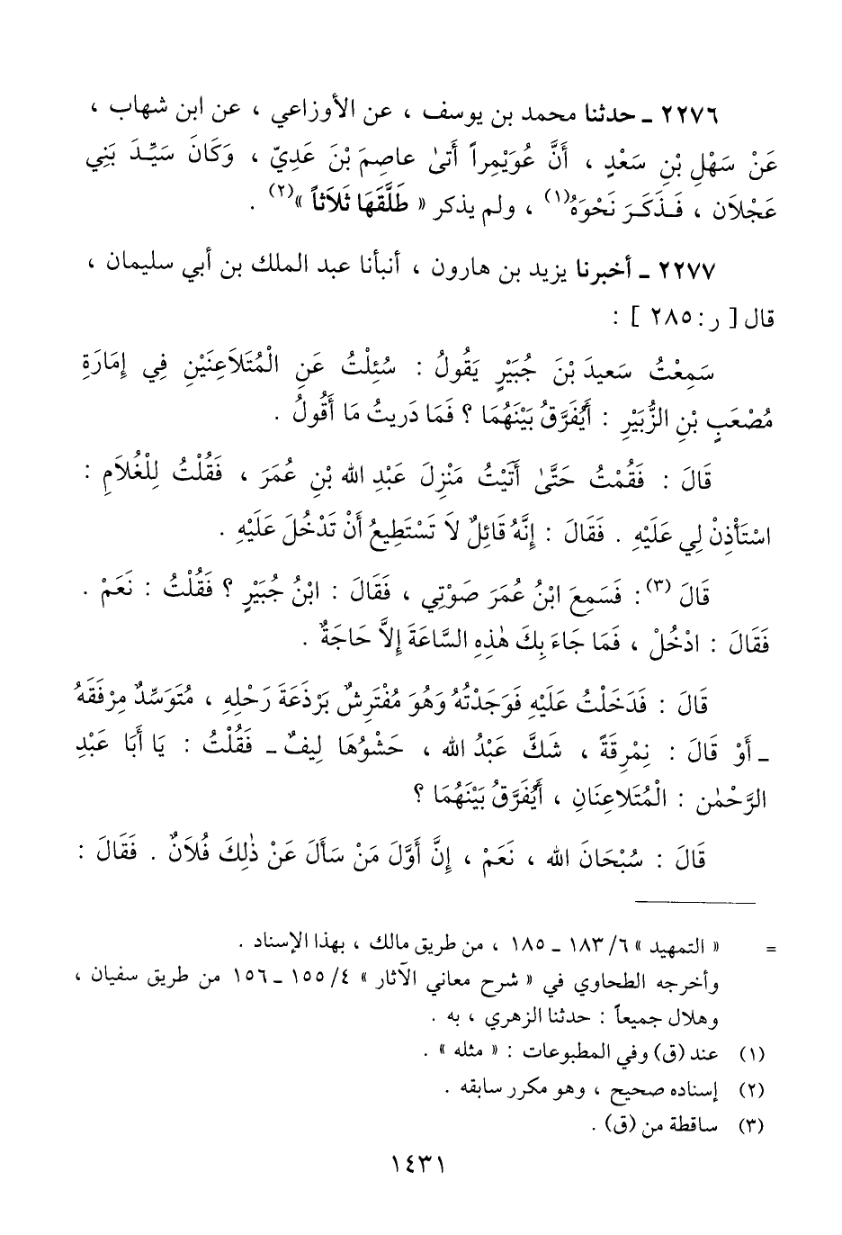 2277 - أَخْبَرَنَا يَزِيدُ بْنُ هَارُونَ، أَنبأَنَا عَبْدُ الْمَلِكِ بْنُ أَبِي سُلَيْمَانَ، قَالَ: سَمِعْتُ سَعِيدَ بْنَ جُبَيْرٍ، يَقُولُ: سُئِلْتُ عَنِ الْمُتَلَاعِنَيْنِ فِي إِمَارَةِ مُصْعَبِ بْنِ الزُّبَيْرِ أَيُفَرَّقُ بَيْنَهُمَا؟ فَمَا دَرَيْتُ مَا أَقُولُ. قَالَ: فَقُمْتُ حَتَّى أَتَيْتُ مَنْزِلَ عَبْدِ اللَّهِ بْنِ عُمَرَ، فَقُلْتُ لِلْغُلَامِ: اسْتَأْذِنْ لِي عَلَيْهِ. فَقَالَ: إِنَّهُ قَائِلٌ لَا تَسْتَطِيعُ أَنْ تَدْخُلَ عَلَيْهِ، قَالَ: فَسَمِعَ ابْنُ عُمَرَ صَوْتِي، فَقَالَ ابْنُ جُبَيْرٍ: فَقُلْتُ: نَعَمْ. فَقَالَ: ادْخُلْ، فَمَا جَاءَ بِكَ هَذِهِ السَّاعَةَ إِلَّا حَاجَةٌ. قَالَ: فَدَخَلْتُ عَلَيْهِ فَوَجَدْتُهُ، وَهُوَ مُفْتَرِشٌ بَرْذَعَةَ رَحْلِهِ، مُتَوَسِّدٌ مِرْفَقَةً - أَوْ قَالَ: نُمْرُقَةً شَكَّ عَبْدُ اللَّهِ، حَشْوُهَا لِيفٌ -، فَقُلْتُ: يَا أَبَا عَبْدِ الرَّحْمَنِ الْمُتَلَاعِنَانِ، أَيُفَرَّقُ بَيْنَهُمَا؟ قَالَ: سُبْحَانَ اللَّهِ، نَعَمْ، إِنَّ أَوَّلَ مَنْ سَأَلَ عَنْ ذَلِكَ فُلَانٌ. فَقَالَ: -[1432]- يَا رَسُولَ اللَّهِ - صَلَّى اللَّهُ عَلَيْكَ -، §أَرَأَيْتَ لَوْ أَنَّ أَحَدَنَا رَأَى امْرَأَتَهُ عَلَى فَاحِشَةٍ، كَيْفَ يَصْنَعُ؟ إِنْ سَكَتَ، سَكَتَ عَلَى أَمْرٍ عَظِيمٍ، وَإِنْ تَكَلَّمَ فَمِثْلُ ذَلِكَ؟ قَالَ: فَسَكَتَ رَسُولُ اللَّهِ صَلَّى اللهُ عَلَيْهِ وَسَلَّمَ فَلَمْ يُجِبْهُ، فَقَامَ لِحَاجَتِهِ، فَلَمَّا كَانَ بَعْدَ ذَلِكَ، أَتَى النَّبِيَّ صَلَّى اللهُ عَلَيْهِ وَسَلَّمَ فَقَالَ: يَا رَسُولَ اللَّهِ، إِنَّ الَّذِي سَأَلْتُكَ عَنْهُ قَدِ ابْتُلِيتُ بِهِ. قَالَ: فَأَنْزَلَ اللَّهُ تَعَالَى هَؤُلَاءِ الْآيَاتِ الَّتِي فِي سُورَةِ النُّورِ {وَالَّذِينَ يَرْمُونَ أَزْوَاجَهُمْ وَلَمْ يَكُنْ لَّهُمْ شُهَدَاءُ إِلَّا أَنْفُسُهُمْ فَشَهَادَةُ أَحَدِهِمْ أَرْبَعُ شَهَادَاتٍ بِاللهِ إِنَّهُ لَمِنَ الصَّادِقِينَ وَالْخَامِسَةُ أَنَّ لَعْنَةَ اللهِ عَلَيْهِ إِن كَانَ مِنَ الْكَاذِبِينَ وَيَدْرَأُ عَنْهَا الْعَذَابَ أَن تَشْهَدَ أَرْبَعَ شَهَادَاتٍ بِاللهِ إِنَّهُ لَمِنَ الْكَاذِبِينَ وَالْخَامِسَةَ أَنَّ غَضَبَ اللهِ عَلَيْهَا إِن كَانَ مِنَ الصَّادِقِين} َحتى ختم هَؤُلَاءِ الْآيَاتِ، قَالَ: فَدَعَا الرَّجُلَ فَتَلَاهُنَّ عَلَيْهِ، وَذَكَّرَهُ بِاللَّهِ، وَأَخْبَرَهُ أَنَّ عَذَابَ الدُّنْيَا أَهْوَنُ مِنْ عَذَابِ الْآخِرَةِ، فَقَالَ: مَا كَذَبْتُ عَلَيْهَا، ثُمَّ دَعَا الْمَرَأَةَ فَوَعَظَهَا وَذَكَّرَهَا، وَأَخْبَرَهَا أَنَّ عَذَابَ الدُّنْيَا أَهْوَنُ مِنْ عَذَابِ الْآخِرَةِ، فَقَالَتْ: وَالَّذِي بَعَثَكَ بِالْحَقِّ إِنَّهُ لَكَاذِبٌ. فَدَعَا الرَّجُلَ فَشَهِدَ أَرْبَعَ شَهَادَاتٍ بِاللَّهِ إِنَّهُ لَمِنَ الصَّادِقِينَ، وَالْخَامِسَةُ أَنَّ لَعْنَةَ اللَّهِ عَلَيْهِ إِنْ كَانَ مِنَ الْكَاذِبِينَ، ثُمَّ أُتِيَ بِالْمَرْأَةِ فَشَهِدَتْ أَرْبَعَ شَهَادَاتٍ بِاللَّهِ إِنَّهُ لَمِنَ الْكَاذِبِينَ، وَالْخَامِسَةَ أَنَّ غَضَبَ اللَّهِ عَلَيْهَا إِنْ كَانَ مِنَ الصَّادِقِينَ، ثُمَّ فَرَّقَ بَيْنَهُمَاQإسناده صحيح