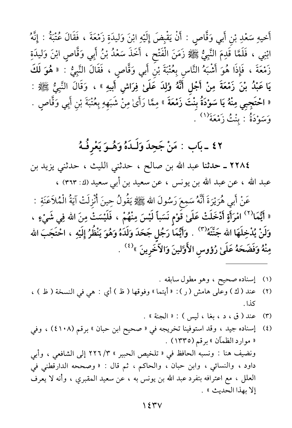 2284 - حَدَّثَنَا عَبْدُ اللَّهِ بْنُ صَالِحٍ، حَدَّثَنِي اللَّيْثُ، حَدَّثَنِي يَزِيدُ بْنُ عَبْدِ اللَّهِ، عَنْ عَبْدِ اللَّهِ بْنِ يُونُسَ، عَنْ سَعِيدِ بْنِ أَبِي سَعِيدٍ، عَنْ أَبِي هُرَيْرَةَ، أَنَّهُ سَمِعَ رَسُولَ اللَّهِ صَلَّى اللهُ عَلَيْهِ وَسَلَّمَ يَقُولُ: حِينَ أُنْزِلَتْ آيَةُ الْمُلَاعَنَةِ «§أَيُّمَا امْرَأَةٍ أَدْخَلَتْ عَلَى قَوْمٍ نَسَبًا لَيْسَ مِنْهُمْ، فَلَيْسَتْ مِنَ اللَّهِ فِي شَيْءٍ، وَلَن يُدْخِلْهَا اللَّهُ جَنَّتَهُ، وَأَيُّمَا رَجُلٍ جَحَدَ وَلَدَهُ، وَهُوَ يَنْظُرُ إِلَيْهِ احْتَجَبَ اللَّهُ مِنْهُ، وَفَضَحَهُ عَلَى رُءُوسِ الْأَوَّلِينَ، وَالْآخِرِينَ» -[1438]- قَالَ عَبْدُ اللَّهِ: قَالَ مُحَمَّدُ بْنُ كَعْبٍ الْقُرَظِيُّ وَسَعِيدٌ: يُحَدِّثَهُ بِهِ بِهََذا، وَقَدْ بَلَغَنِي هَذَا الْحَدِيثُ عَنْ رَسُولِ اللَّهِ صَلَّى اللهُ عَلَيْهِ وَسَلَّمَQإسناده جيد