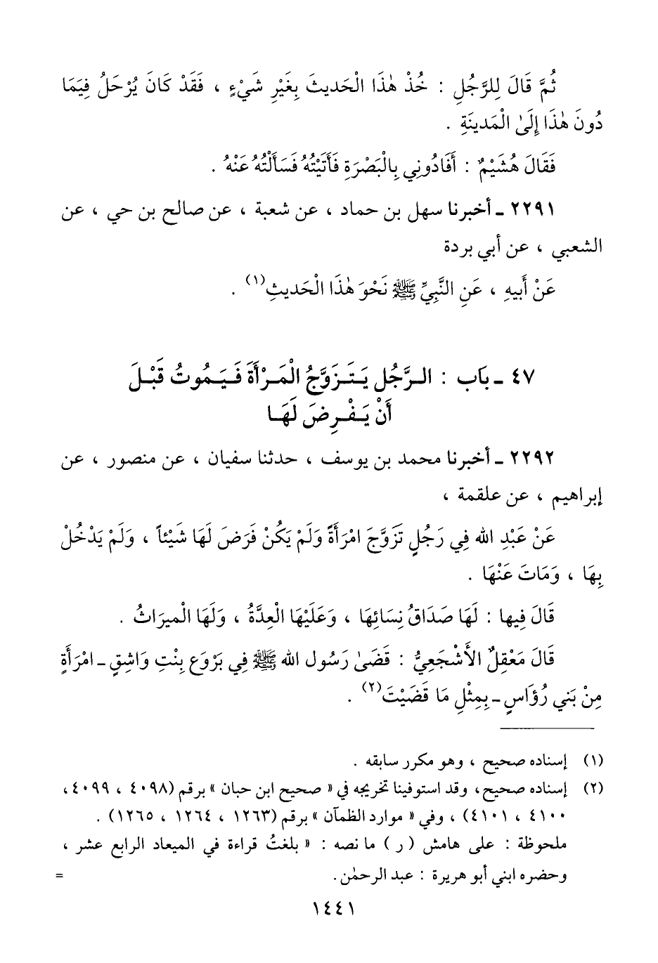 2292 - أَخْبَرَنَا مُحَمَّدُ بْنُ يُوسُفَ، حَدَّثَنَا سُفْيَانُ، عَنْ مَنْصُورٍ، عَنْ إِبْرَاهِيمَ، عَنْ عَلْقَمَةَ، عَنْ عَبْدِ اللَّهِ، فِي رَجُلٍ تَزَوَّجَ امْرَأَةً وَلَمْ يَكُنْ فَرَضَ لَهَا شَيْئًا، وَلَمْ يَدْخُلْ بِهَا، وَمَاتَ عَنْهَا، قَالَ فِيهَا: لَهَا صَدَاقُ نِسَائِهَا، وَعَلَيْهَا الْعِدَّةُ، وَلَهَا الْمِيرَاثُ، قَالَ مَعْقِلٌ الْأَشْجَعِيُّ: «§قَضَى رَسُولُ اللَّهِ صَلَّى اللهُ عَلَيْهِ وَسَلَّمَ فِي بِرْوَعَ بِنْتِ وَاشِقٍ امْرَأَةٍ مِنْ بَنِي رُؤَاسٍ بِمِثْلِ مَا قَضَيْتَ» -[1442]- قَالَ: فَفَرِحَ بِذَلِكَ، قَالَ مُحَمَّدٌ: وَسُفْيَانُ نَأْخُذُ بِهَذَاQإسناده صحيح وهو عند مالك في الرضاع