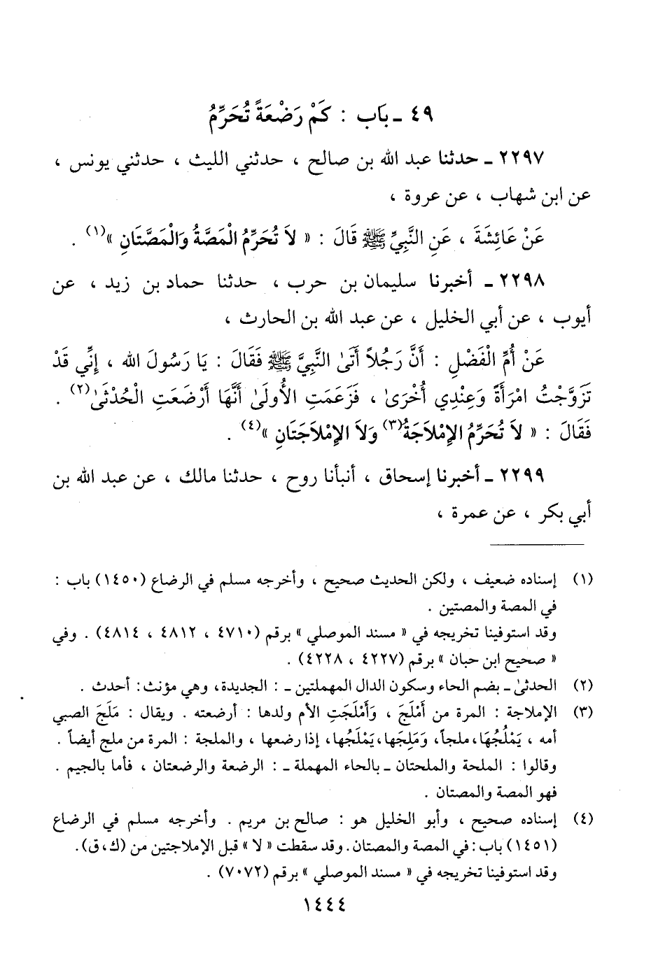 2297 - حَدَّثَنَا عَبْدُ اللَّهِ بْنُ صَالِحٍ، حَدَّثَنِي اللَّيْثُ، حَدَّثَنِي يُونُسُ، عَنْ ابْنِ شِهَابٍ، عَنْ عُرْوَةَ، عَنْ عَائِشَةَ، عَنِ النَّبِيِّ صَلَّى اللهُ عَلَيْهِ وَسَلَّمَ قَالَ: «§لَا تُحَرِّمُ الْمَصَّةُ وَالْمَصَّتَانِ» Qإسناده ضعيف ولكن الحديث صحيح