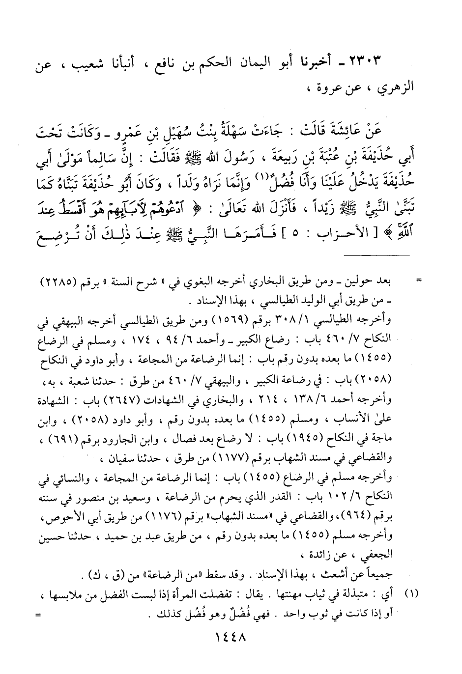 2303 - أَخْبَرَنَا أَبُو الْيَمَانِ الْحَكَمُ بْنُ نَافِعٍ، أَنْبَأََنَا شُعَيْبٌ، عَنْ الزُّهْرِيِّ، عَنْ عُرْوَةَ، عَنْ عَائِشَةَ، قَالَتْ: §جَاءَتْ سَهْلَةُ بِنْتُ سُهَيْلِ بْنِ عَمْرٍو وَكَانَتْ تَحْتَ أَبِي حُذَيْفَةَ بْنِ عُتْبَةَ بْنِ رَبِيعَةَ رَسُولَ اللَّهِ صَلَّى اللهُ عَلَيْهِ وَسَلَّمَ، فَقَالَتْ: إِنَّ سَالِمًا مَوْلَى أَبِي حُذَيْفَةَ يَدْخُلُ عَلَيْنَا، وَأَنَا فُضُلٌ، وَإِنَّمَا نَرَاهُ وَلَدًا، وَكَانَ أَبُو حُذَيْفَةَ تَبَنَّاهُ كَمَا تَبَنَّى النَّبِيُّ صَلَّى اللهُ عَلَيْهِ وَسَلَّمَ زَيْدًا، فَأَنْزَلَ اللَّهُ تَعَالَى {ادْعُوهُمْ لِآبَائِهِمْ هُوَ أَقْسَطُ عِنْدَ اللَّهِ} [الأحزاب: 5] فَأَمَرَهَا النَّبِيُّ صَلَّى اللهُ عَلَيْهِ وَسَلَّمَ عِنْدَ ذَلِكَ أَنْ تُرْضِعَ -[1449]- سَالِمًا، -[1450]- قَالَ أَبُو مُحَمَّد: «هَذَا لِسَالِمٍ خَاصَّةً» Qإسناده صحيح والحديث متفق عليه