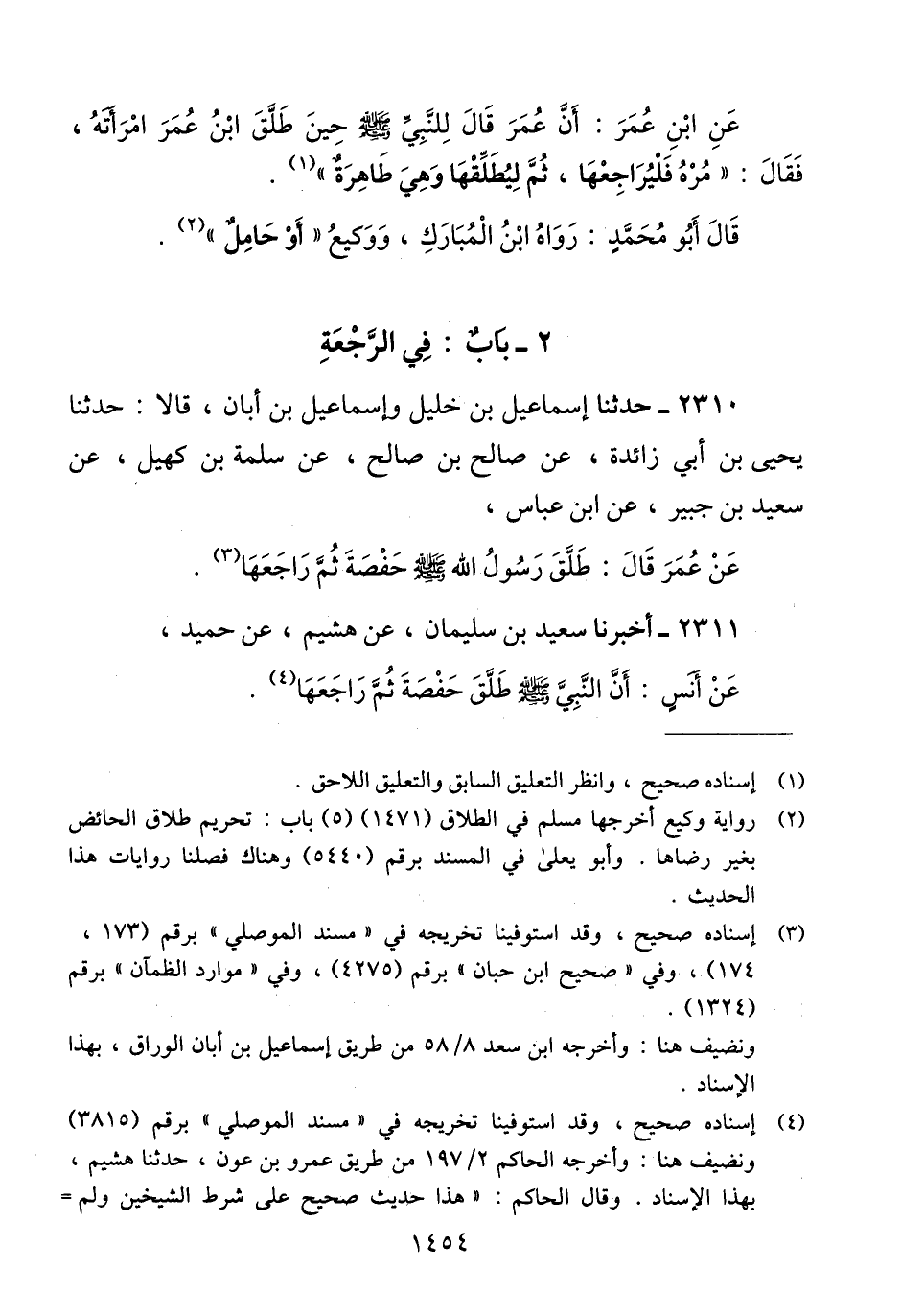 2310 - حَدَّثَنَا إِسْمَاعِيلُ بْنُ خَلِيلٍ، وَإِسْمَاعِيلُ بْنُ أَبَانَ، قَالَا: حَدَّثَنَا يَحْيَى بْنُ أَبِي زَائِدَةَ، عَنْ صَالِحِ بْنِ صَالِحٍ، عَنْ سَلَمَةَ بْنِ كُهَيْلٍ، عَنْ سَعِيدِ بْنِ جُبَيْرٍ، عَنْ ابْنِ عَبَّاسٍ، عَنْ عُمَرَ، قَالَ: «§طَلَّقَ رَسُولُ اللَّهِ صَلَّى اللهُ عَلَيْهِ وَسَلَّمَ حَفْصَةَ، ثُمَّ رَاجَعَهَا» Qإسناده صحيح