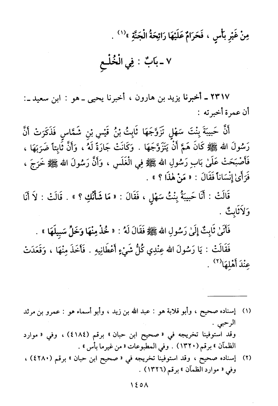 2317 - أَخْبَرَنَا يَزِيدُ بْنُ هَارُونَ، أَخْبَرَنَا يَحْيَى هُوَ ابْنُ سَعِيدٍ أَنَّ عَمْرَةَ، أَخْبَرَتْهُ أَنَّ حَبِيبَةَ بِنْتَ سَهْلٍ تَزَوَّجَهَا ثَابِتُ بْنُ قَيْسِ بْنِ شَمَّاسٍ، فَذَكَرَتْ أَنَّ رَسُولَ اللَّهِ صَلَّى اللهُ عَلَيْهِ وَسَلَّمَ كَانَ هَمَّ أَنْ يَتَزَوَّجَهَا، وَكَانَتْ جَارَةً لَهُ، وَأَنَّ ثَابِتًا ضَرَبَهَا فَأَصْبَحَتْ عَلَى بَابِ رَسُولِ اللَّهِ صَلَّى اللهُ عَلَيْهِ وَسَلَّمَ فِي الْغَلَسِ، وَأَنَّ رَسُولَ اللَّهِ صَلَّى اللهُ عَلَيْهِ وَسَلَّمَ §خَرَجَ فَرَأَى إِنْسَانًا، فَقَالَ: «مَنْ هَذَا؟» قَالَتْ: أَنَا حَبِيبَةُ بِنْتُ سَهْلٍ، فَقَالَ: «مَا شَأْنُكِ؟» قَالَتْ: لَا أَنَا، وَلَا ثَابِتٌ، فَأَتَى ثَابِتٌ إِلَى رَسُولِ اللَّهِ صَلَّى اللهُ عَلَيْهِ وَسَلَّمَ، فَقَالَ لَهُ رَسُولُ اللَّهِ: «خُذْ مِنْهَا، وَخَلِّ سَبِيلَهَا» فَقَالَتْ: يَا رَسُولَ اللَّهِ عِنْدِي كُلُّ شَيْءٍ أَعْطَانِيهِ، فَأَخَذَ مِنْهَا، وَقَعَدَتْ عِنْدَ أَهْلِهَاQإسناده صحيح
