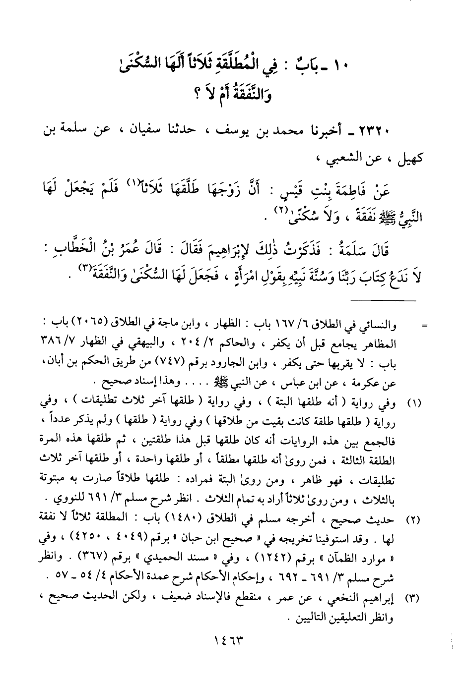 2320 - أَخْبَرَنَا مُحَمَّدُ بْنُ يُوسُفَ، حَدَّثَنَا سُفْيَانُ، عَنْ سَلَمَةَ بْنِ كُهَيْلٍ، عَنْ الشَّعْبِيِّ، عَنْ فَاطِمَةَ بِنْتِ قَيْسٍ، أَنَّ §زَوْجَهَا طَلَّقَهَا ثَلَاثًا «فَلَمْ يَجْعَلْ لَهَا النَّبِيُّ صَلَّى اللهُ عَلَيْهِ وَسَلَّمَ نَفَقَةً، وَلَا سُكْنَى» قَالَ سَلَمَةُ: فَذَكَرْتُ ذَلِكَ لِإِبْرَاهِيمَ، فَقَالَ: قَالَ عُمَرُ بْنُ الْخَطَّابِ: لَا نَدَعُ كِتَابَ رَبِّنَا، وَسُنَّةَ نَبِيِّهِ، بِقَوْلِ امْرَأَةٍ: فَجَعَلَ لَهَا السُّكْنَى وَالنَّفَقَةَQحديث صحيح