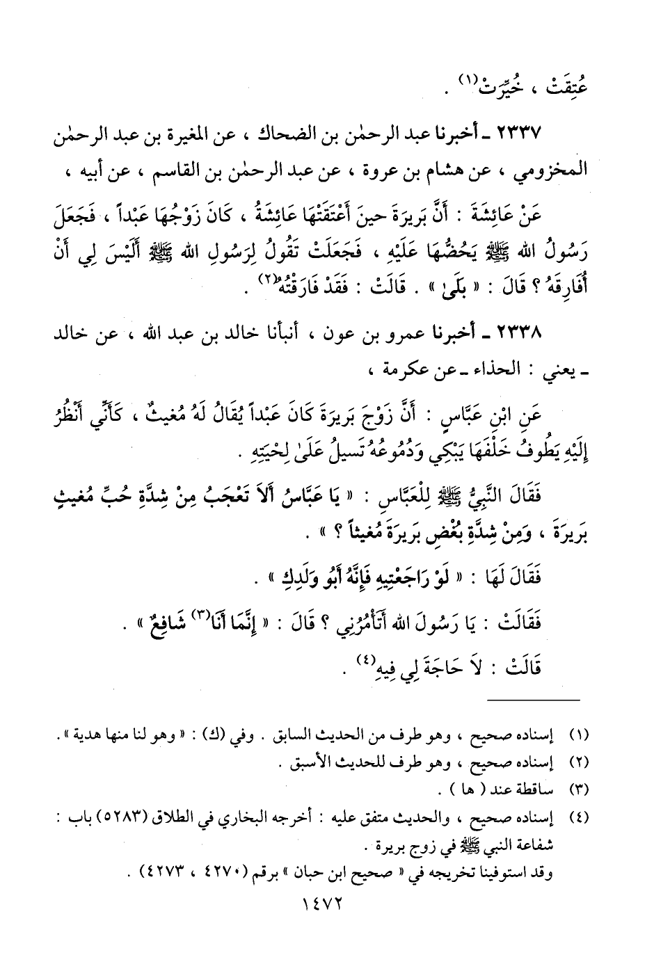2338 - أَخْبَرَنَا عَمْرُو بْنُ عَوْنٍ، أَنْبَأََنَا خَالِدُ بْنُ عَبْدِ اللَّهِ، عَنْ خَالِدٍ يَعْنِي الْحَذَّاءَ، عَنْ عِكْرِمَةَ، عَنْ ابْنِ عَبَّاسٍ، أَنَّ زَوْجَ بَرِيرَةَ، كَانَ عَبْدًا يُقَالُ لَهُ: مُغِيثٌ كَأَنِّي أَنْظُرُ إِلَيْهِ يَطُوفُ خَلْفَهَا يَبْكِي وَدُمُوعُهُ تَسِيلُ عَلَى لِحْيَتِهِ، فَقَالَ النَّبِيُّ صَلَّى اللهُ عَلَيْهِ وَسَلَّمَ لِلْعَبَّاسِ: يَا عَبَّاسُ «§أَلَا تَعْجَبُ مِنْ شِدَّةِ حُبِّ مُغِيثٍ بَرِيرَةَ، وَمِنْ شِدَّةِ بُغْضِ بَرِيرَةَ مُغِيثًا»، فَقَالَ لَهَا: «لَوْ رَاجَعْتِيهِ فَإِنَّهُ أَبُو وَلَدِكِ»، فَقَالَتْ: يَا رَسُولَ اللَّهِ أَتَأْمُرُنِي؟ قَالَ: «إِنَّمَا أَنَا شَافِعٌ»، قَالَتْ: لَا حَاجَةَ لِي فِيهِQإسناده صحيح والحديث متفق عليه