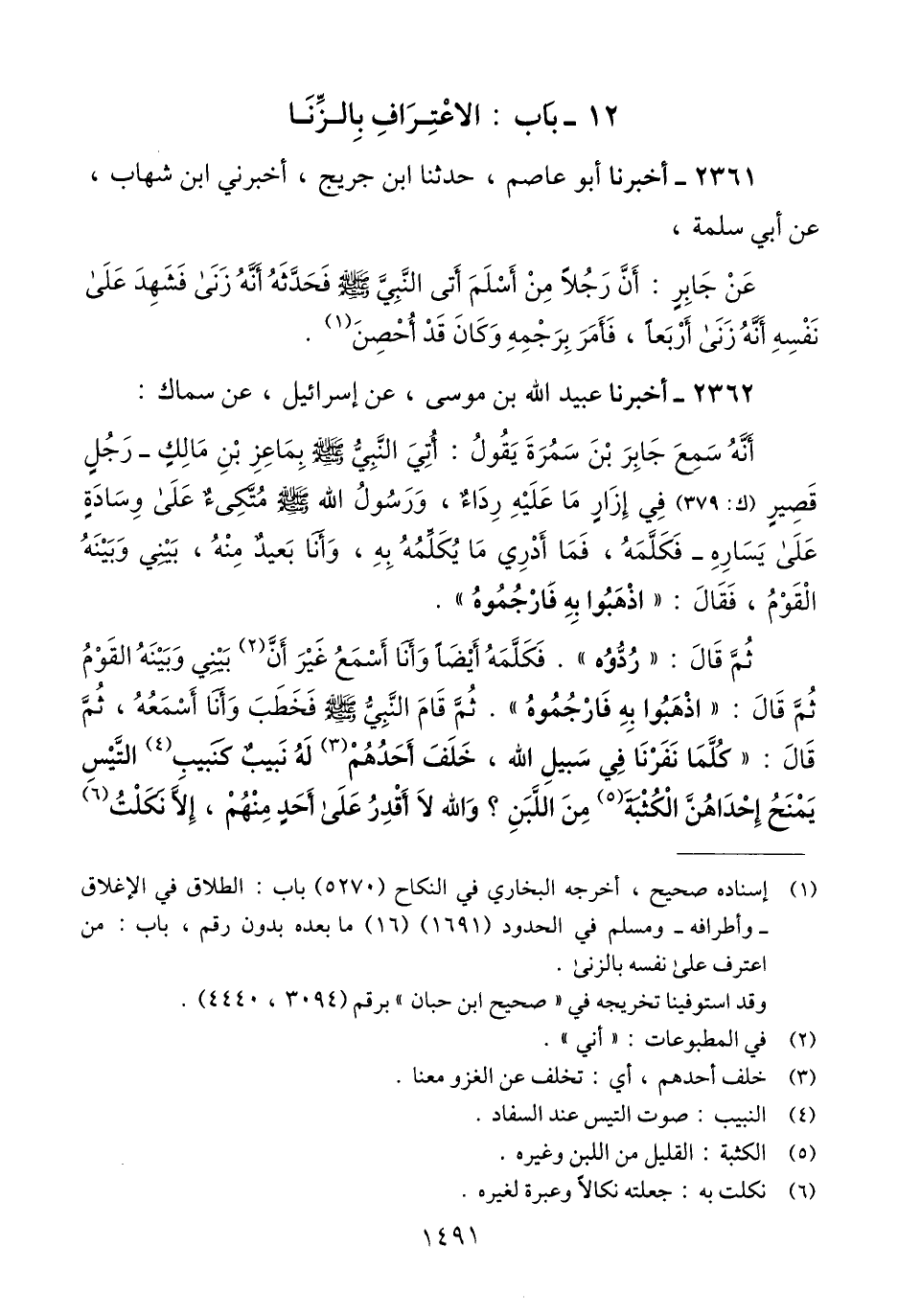 2361 - أَخْبَرَنَا أَبُو عَاصِمٍ، حَدَّثَنَا ابْنُ جُرَيْجٍ، أَخْبَرَنِي ابْنُ شِهَابٍ، عَنْ أَبِي سَلَمَةَ، عَنْ جَابِرٍ، أَنَّ §رَجُلًا مِنْ أَسْلَمَ أَتَى النَّبِيَّ صَلَّى اللهُ عَلَيْهِ وَسَلَّمَ فَحَدَّثَهُ أَنَّهُ زَنَى، فَشَهِدَ عَلَى نَفْسِهِ أَنَّهُ زَنَى، أَرْبَعًا «فَأَمَرَ بِرَجْمِهِ، وَكَانَ قَدْ أُحْصِنَ» Qإسناده صحيح