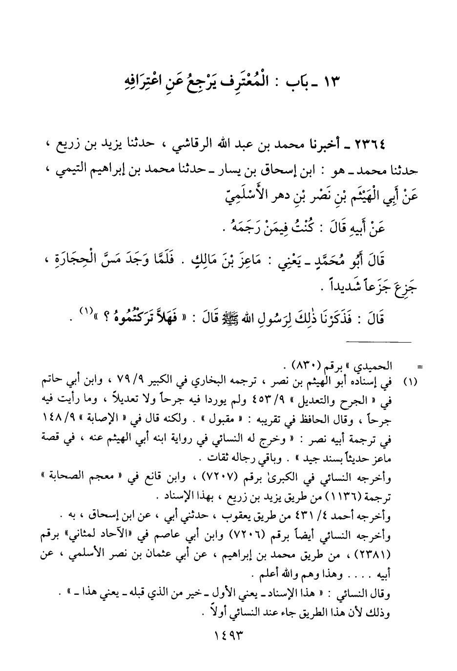 2364 - أَخْبَرَنَا مُحَمَّدُ بْنُ عَبْدِ اللَّهِ الرَّقَاشِيُّ، حَدَّثَنَا يَزِيدُ بْنُ زُرَيْعٍ، حَدَّثَنَا مُحَمَّدٌ هُوَ ابْنُ إِسْحَاقَ بْنِ يَسَارٍ، حَدَّثَنَا مُحَمَّدُ بْنُ إِبْرَاهِيمَ التَّيْمِيُّ، عَنْ أَبِي الْهَيْثَمِ بْنِ نَصْرِ بْنِ دَهْرٍ الْأَسْلَمِيِّ، عَنْ أَبِيهِ، قَالَ: كُنْتُ فِيمَنْ رَجَمَهُ، قَالَ أَبُو مُحَمَّد: يَعْنِي مَاعِزَ بْنَ مَالِكٍ: «فَلَمَّا وَجَدَ مَسَّ الْحِجَارَةِ جَزِعَ جَزَعًا شَدِيدًا»، قَالَ: فَذَكَرْنَا ذَلِكَ لِرَسُولِ اللَّهِ صَلَّى اللهُ عَلَيْهِ وَسَلَّمَ قَالَ: «§فَهَلَّا تَرَكْتُمُوهُ» Qفي إسناده أبو الهيثم بن نصر ترجمة البخاري في الكبير 79/ 9، وابن أبي حاتم في " الجرح والتعديل " 453/ 9 ولم يوردا فيه جرحا ولا تعديلا وما رأيت فيه جرحا