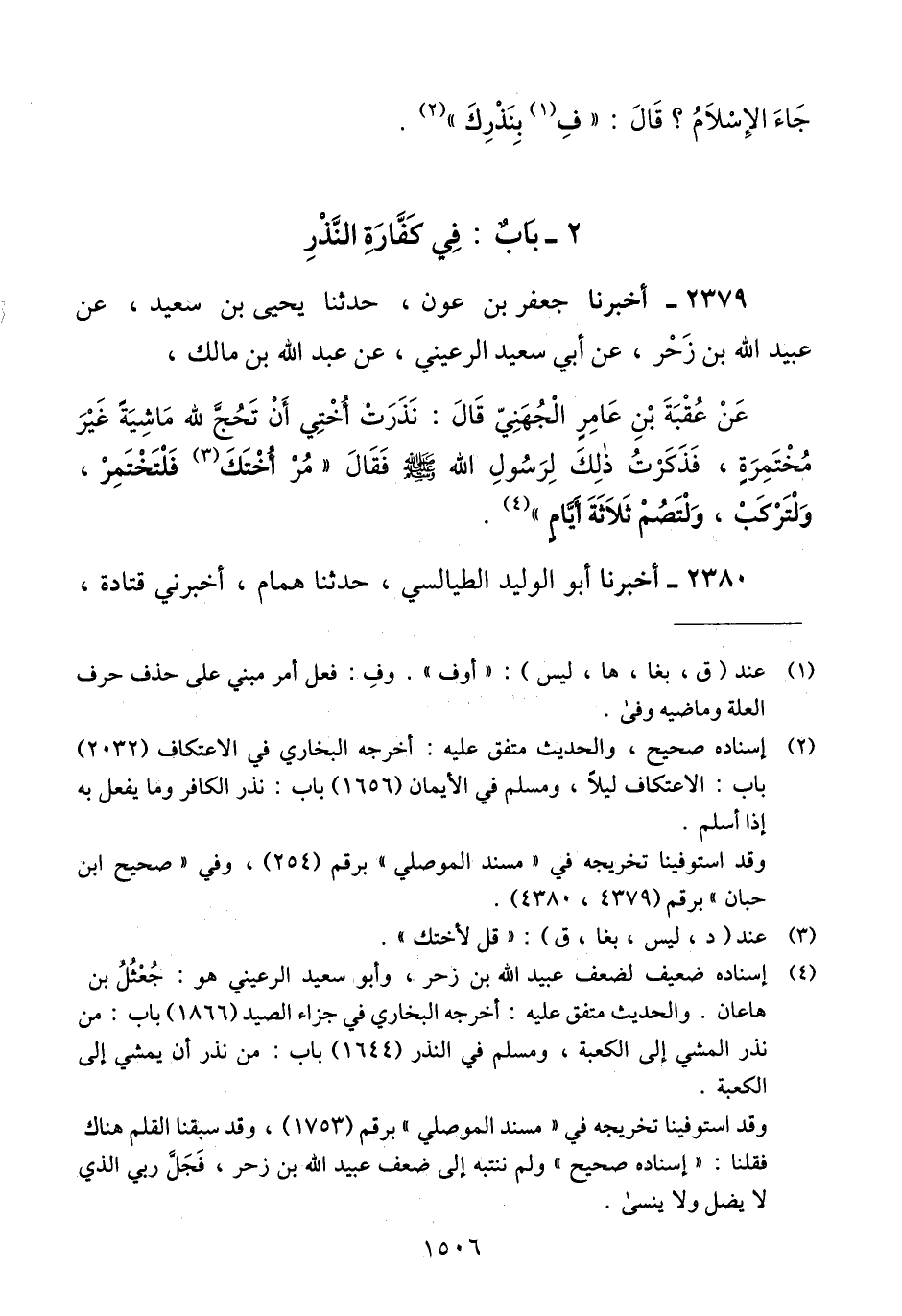 2379 - أَخْبَرَنَا جَعْفَرُ بْنُ عَوْنٍ، حَدَّثَنَا يَحْيَى بْنُ سَعِيدٍ، عَنْ عُبَيْدِ اللَّهِ بْنِ زَحْرٍ، عَنْ أَبِي سَعِيدٍ الرُّعَيْنِيِّ، عَنْ عَبْدِ اللَّهِ بْنِ مَالِكٍ، عَنْ عُقْبَةَ بْنِ عَامِرٍ الْجُهَنِيِّ، قَالَ: نَذَرَتْ أُخْتِي أَنْ تَحُجَّ لِلَّهِ مَاشِيَةً غَيْرَ مُخْتَمِرَةٍ، فَذَكَرْتُ ذَلِكَ لِرَسُولِ اللَّهِ صَلَّى اللهُ عَلَيْهِ وَسَلَّمَ فَقَالَ: «§مُرْ أُخْتَكَ فَلْتَخْتَمِرْ، وَلْتَرْكَبْ، وَلْتَصُمْ ثَلَاثَةَ أَيَّامٍ» Qإسناده ضعيف لضعف عبيد الله بن زحر وأبو سعيد الرعيني هو: جعثل بن هاعان. والحديث متفق عليه