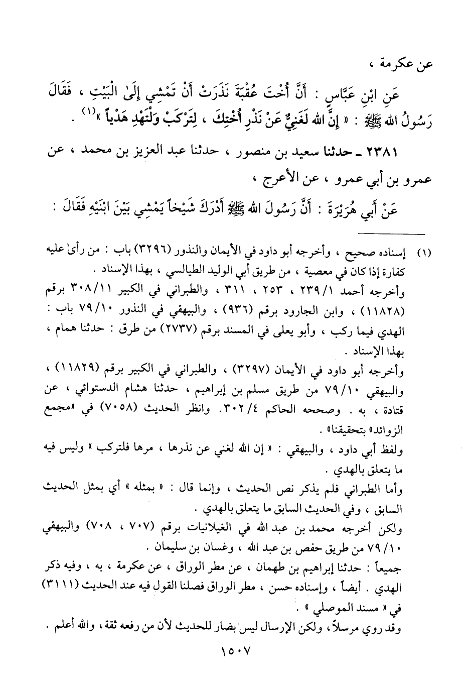 2381 - حَدَّثَنَا سَعِيدُ بْنُ مَنْصُورٍ، حَدَّثَنَا عَبْدُ الْعَزِيزِ بْنُ مُحَمَّدٍ، عَنْ عَمْرِو بْنِ أَبِي عَمْرٍو، عَنْ الْأَعْرَجِ، عَنْ أَبِي هُرَيْرَةَ، أَنَّ رَسُولَ اللَّهِ صَلَّى اللهُ عَلَيْهِ وَسَلَّمَ أَدْرَكَ شَيْخًا يَمْشِي بَيْنَ ابْنَيْهِ، فَقَالَ: -[1508]- مَا شَأْنُ هَذَا الشَّيْخِ؟ فَقَالَ: ابْنَاهُ نَذَرَ أَنْ يَمْشِيَ، فَقَالَ: «§ارْكَبْ فَإِنَّ اللَّهَ غَنِيٌّ عَنْكَ، وَعَنْ نَذْرِكَ» Qإسناده صحيح