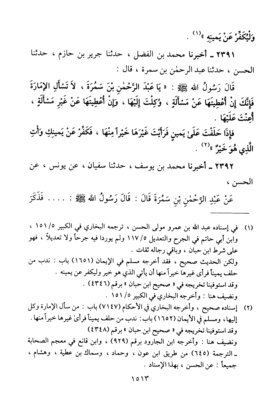 2391 - أَخْبَرَنَا مُحَمَّدُ بْنُ الْفَضْلِ، حَدَّثَنَا جَرِيرُ بْنُ حَازِمٍ، حَدَّثَنَا الْحَسَنُ، حَدَّثَنَا عَبْدُ الرَّحْمَنِ بْنُ سَمُرَةَ، قَالَ: قَالَ رَسُولُ اللَّهِ صَلَّى اللهُ عَلَيْهِ وَسَلَّمَ: يَا عَبْدَ الرَّحْمَنِ بْنَ سَمُرَةَ «§لَا تَسْأَلِ الْإِمَارَةَ فَإِنَّكَ إِنْ أُعْطِيتَهَا، عَنْ مَسْأَلَةٍ، وُكِلْتَ إِلَيْهَا، وَإِنْ أُعْطِيتَهَا مِنْ غَيْرِ مَسْأَلَةٍ، أُعِنْتَ عَلَيْهَا، فَإِذَا حَلَفْتَ عَلَى يَمِينٍ، فَرَأَيْتَ غَيْرَهَا خَيْرًا مِنْهَا، فَكَفِّرْ عَنْ يَمِينِكَ، وَأْتِ الَّذِي هُوَ خَيْرٌ» Qإسناده صحيح وأخرجه البخاري في الأحكام