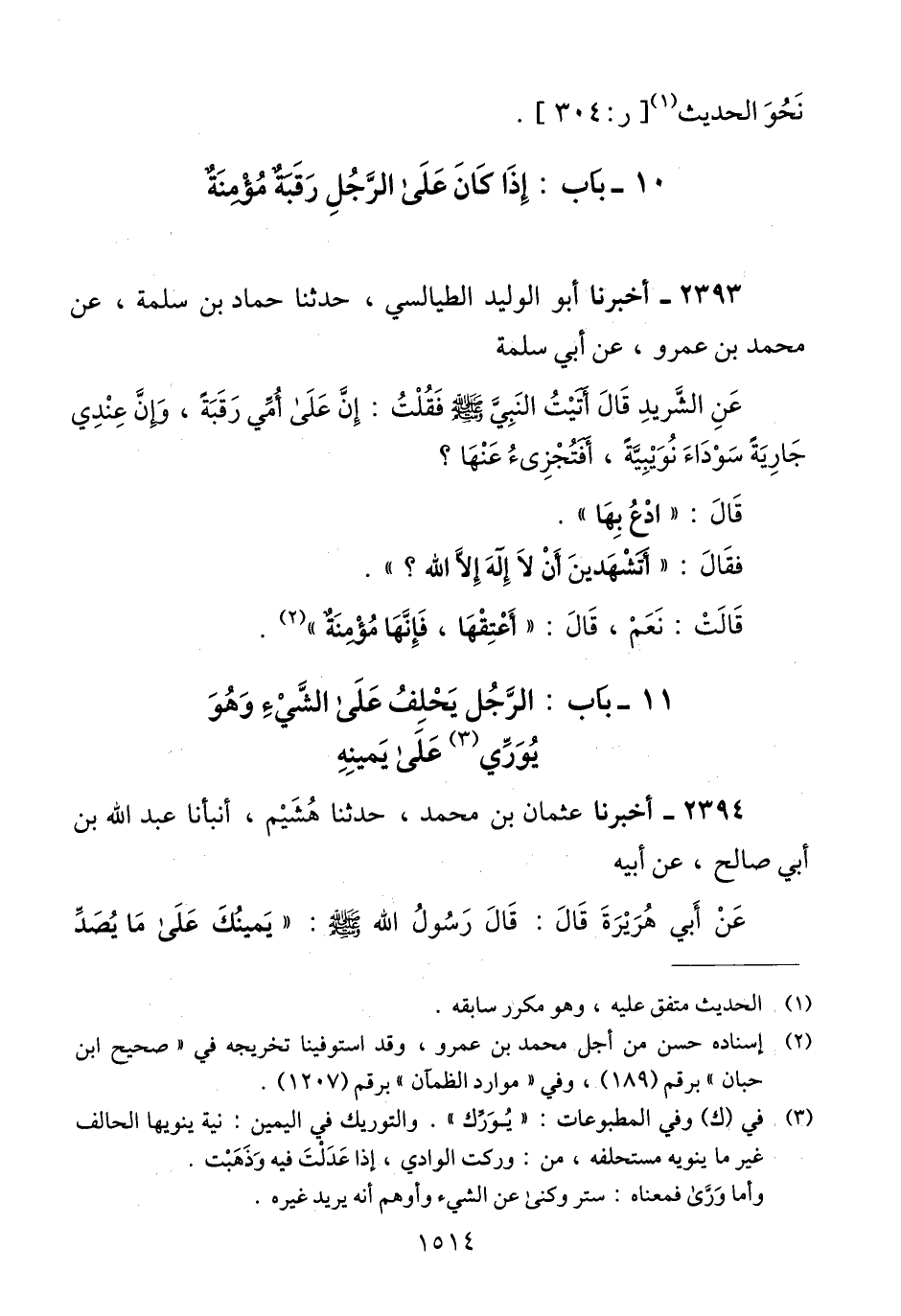 2393 - أَخْبَرَنَا أَبُو الْوَلِيدِ الطَّيَالِسِيُّ، حَدَّثَنَا حَمَّادُ بْنُ سَلَمَةَ، عَنْ مُحَمَّدِ بْنِ عَمْرٍو، عَنْ أَبِي سَلَمَةَ، عَنْ الشَّرِيدِ، قَالَ: أَتَيْتُ النَّبِيَّ صَلَّى اللهُ عَلَيْهِ وَسَلَّمَ فَقُلْتُ: إِنَّ عَلَى أُمِّي رَقَبَةً، وَإِنَّ §عِنْدِي جَارِيَةً سَوْدَاءَ نُوبِيَّةً، أَفَتُجْزِئُ عَنْهَا، قَالَ: «ادْعُ بِهَا» فَقَالَ: أَتَشْهَدِينَ أَنْ لَا إِلَهَ إِلَّا اللَّهُ، قَالَتْ: نَعَمْ، قَالَ: «أَعْتِقْهَا فَإِنَّهَا مُؤْمِنَةٌ» Qإسناده حسن من أجل محمد بن عمرو