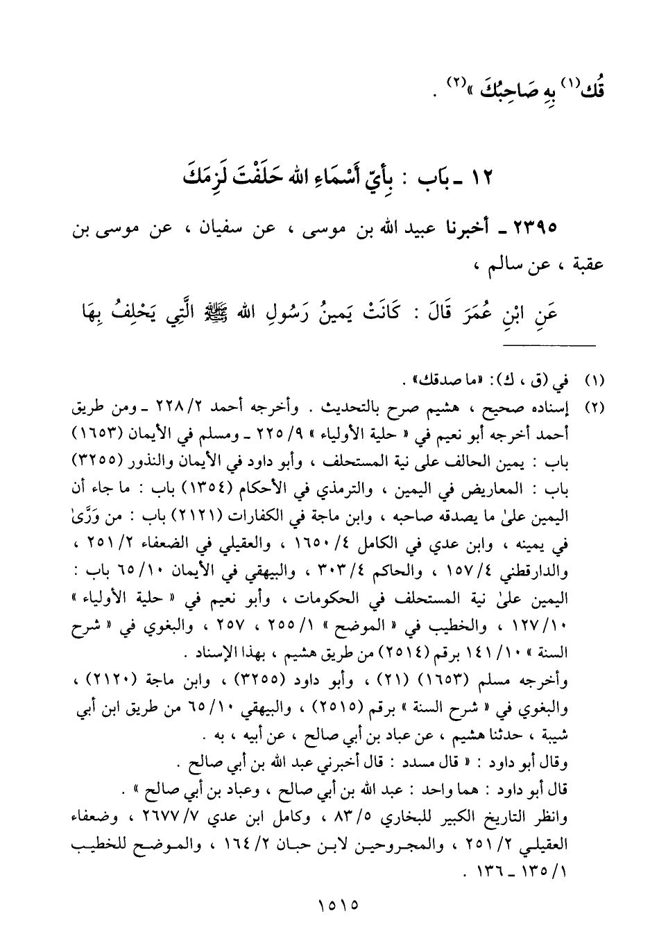 2395 - أَخْبَرَنَا عُبَيْدُ اللَّهِ بْنُ مُوسَى، عَنْ سُفْيَانَ، عَنْ مُوسَى بْنِ عُقْبَةَ، عَنْ سَالِمٍ، عَنْ ابْنِ عُمَرَ، قَالَ: كَانَتْ يَمِينُ رَسُولِ اللَّهِ صَلَّى اللهُ عَلَيْهِ وَسَلَّمَ الَّتِي يَحْلِفُ بِهَا -[1516]- «§لَا وَمُقَلِّبِ الْقُلُوبِ» Qإسناده صحيح وأخرجه البخاري في القدر