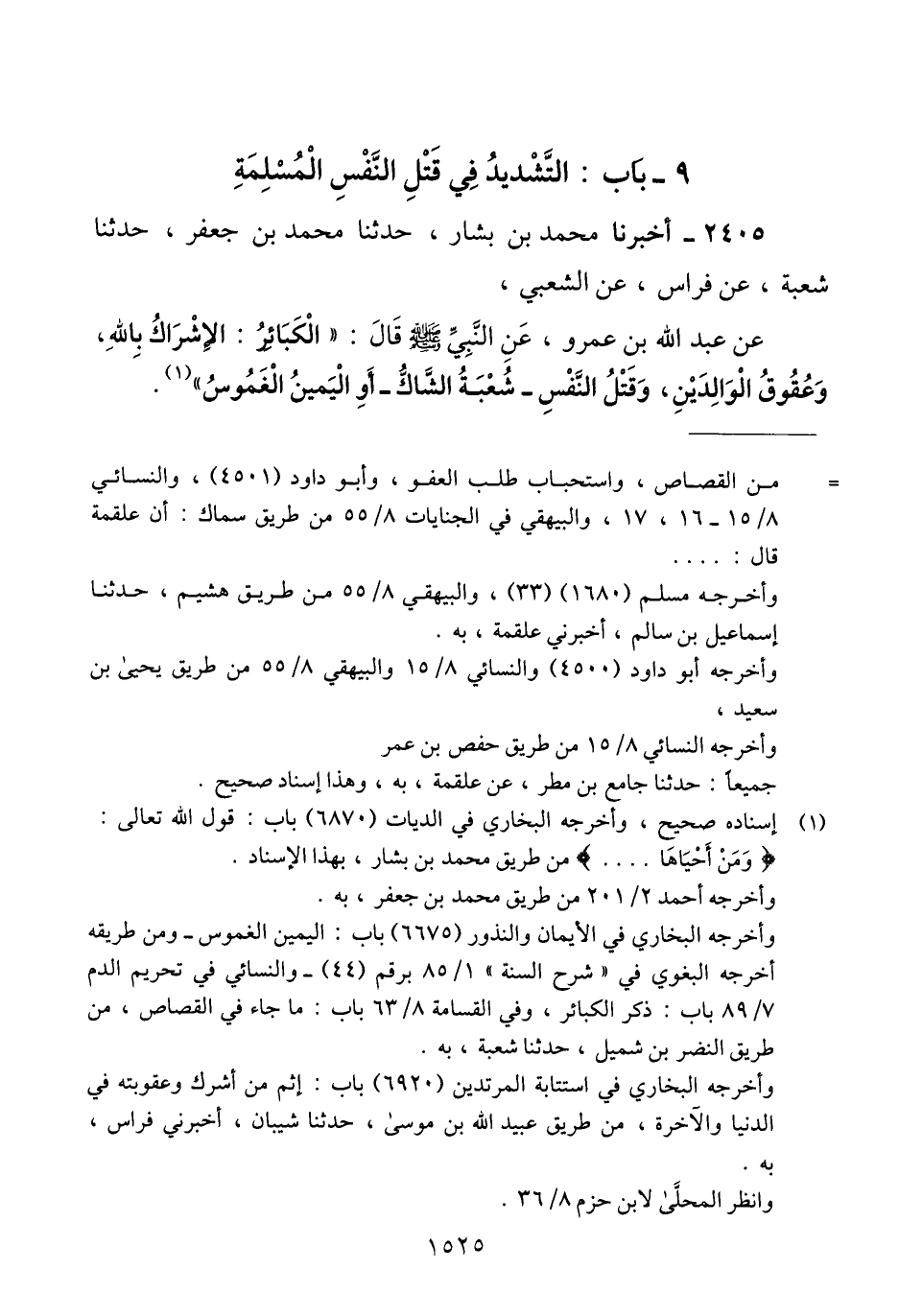 2405 - أَخْبَرَنَا مُحَمَّدُ بْنُ بَشَّارٍ، حَدَّثَنَا مُحَمَّدُ بْنُ جَعْفَرٍ، حَدَّثَنَا شُعْبَةُ، عَنْ فِرَاسٍ، عَنْ الشَّعْبِيِّ، عَنْ عَبْدِ اللَّهِ بْنِ عَمْرٍو، عَنِ النَّبِيِّ صَلَّى اللهُ عَلَيْهِ وَسَلَّمَ قَالَ: «§الْكَبَائِرُ الْإِشْرَاكُ بِاللَّهِ، وَعُقُوقُ الْوَالِدَيْنِ، وَقَتْلُ النَّفْسِ شُعْبَةُ الشَّاكُّ أَوِ الْيَمِينُ الْغَمُوسُ» Qإسناده صحيح