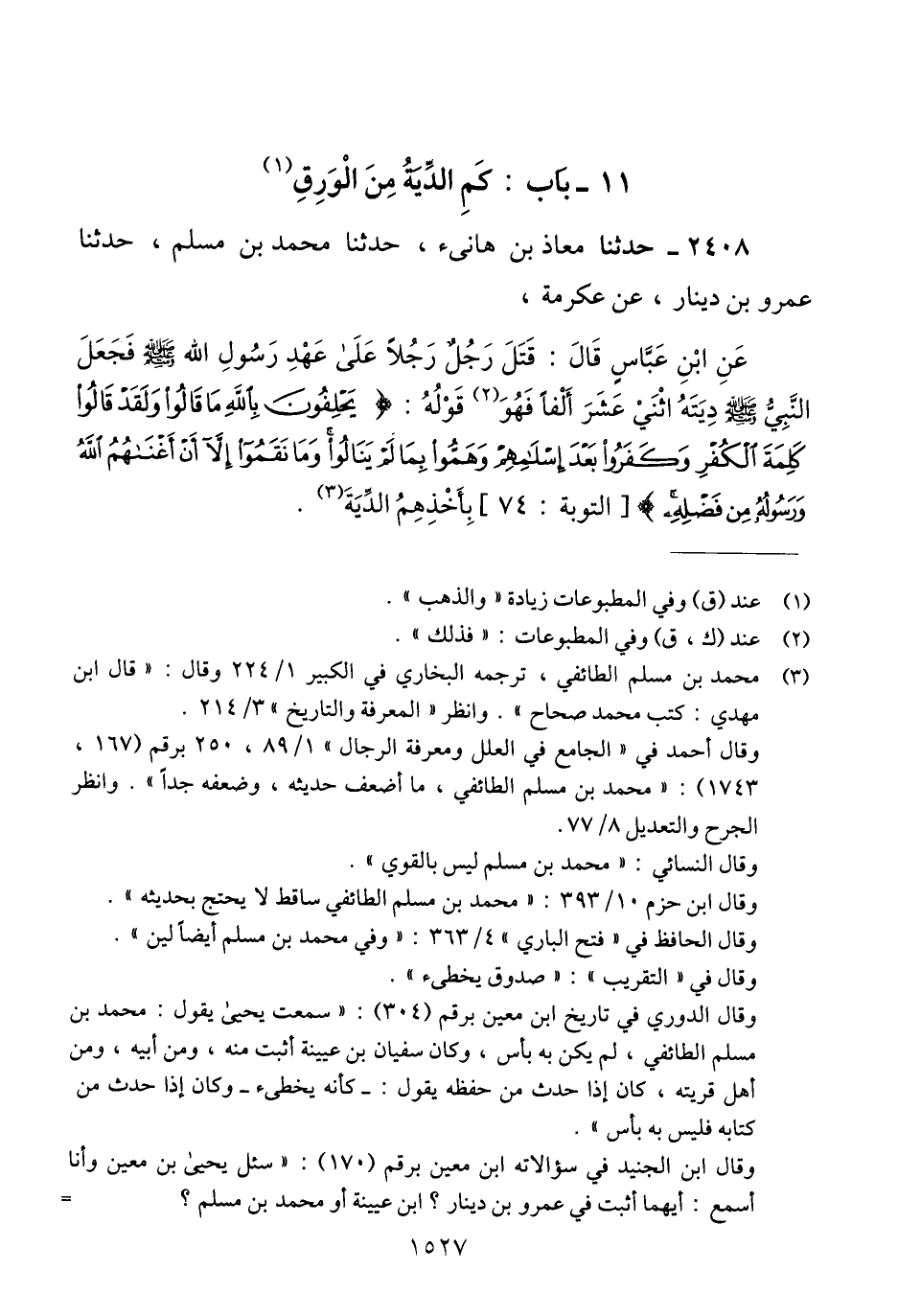 2408 - حَدَّثَنَا مُعَاذُ بْنُ هَانِئٍ، حَدَّثَنَا مُحَمَّدُ بْنُ مُسْلِمٍ، حَدَّثَنَا عَمْرُو بْنُ دِينَارٍ، عَنْ عِكْرِمَةَ، عَنْ ابْنِ عَبَّاسٍ، قَالَ: قَتَلَ رَجُلٌ رَجُلًا عَلَى عَهْدِ رَسُولِ اللَّهِ صَلَّى اللهُ عَلَيْهِ وَسَلَّمَ §فَجَعَلَ النَّبِيُّ صَلَّى اللهُ عَلَيْهِ وَسَلَّمَ دِيَتَهُ اثْنَيْ عَشَرَ أَلْفًا، فهو قَوْلُهُ، " {يَحْلِفُونَ بِاللَّهِ مَا قَالُوا وَلَقَدْ قَالُوا كَلِمَةَ الْكُفْرِ وَكَفَرُوا بَعْدَ إِسْلَامِهِمْ وَهَمُّوا بِمَا لَمْ يَنَالُوا وَمَا نَقَمُوا إِلَّا أَنْ أَغْنَاهُمُ اللَّهُ وَرَسُولُهُ مِنْ فَضْلِهِ} [التوبة: 74] بِأَخْذِهِمُ الدِّيَةَ "