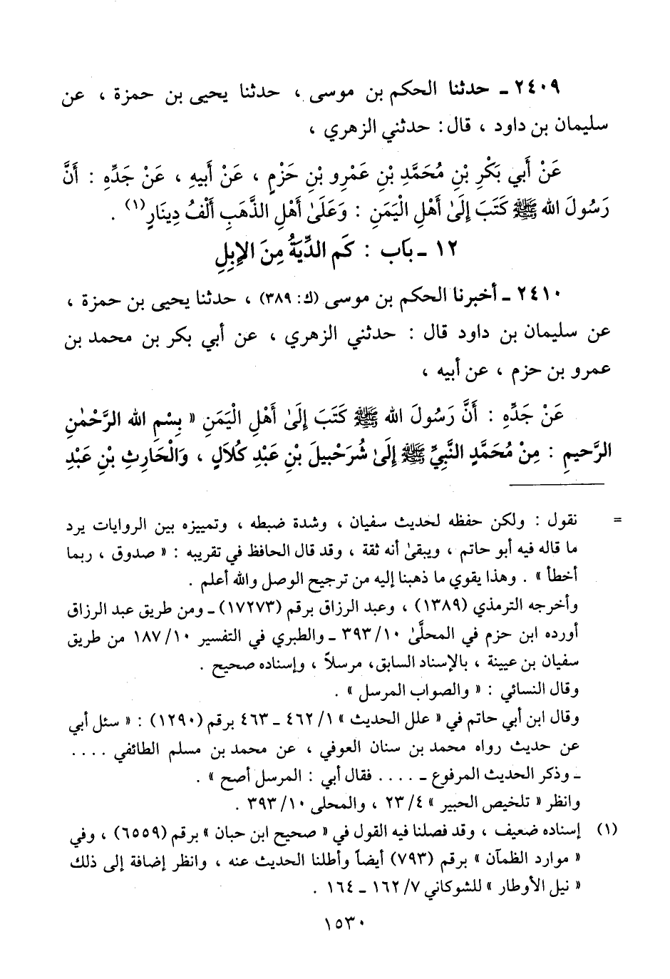 2410 - أَخْبَرَنَا الْحَكَمُ بْنُ مُوسَى، حَدَّثَنَا يَحْيَى بْنُ حَمْزَةَ، عَنْ سُلَيْمَانَ بْنِ دَاوُدَ، حَدَّثَنِي الزُّهْرِيُّ، عَنْ أَبِي بَكْرِ بْنِ مُحَمَّدِ بْنِ عَمْرِو بْنِ حَزْمٍ، عَنْ أَبِيهِ، عَنْ جَدِّهِ، أَنَّ رَسُولَ اللَّهِ صَلَّى اللهُ عَلَيْهِ وَسَلَّمَ كَتَبَ إِلَى أَهْلِ الْيَمَنِ بِسْمِ اللَّهِ الرَّحْمَنِ الرَّحِيمِ مِنْ مُحَمَّدٍ النَّبِيِّ صَلَّى اللهُ عَلَيْهِ وَسَلَّمَ إِلَى شُرَحْبِيلَ بْنِ عَبْدِ كُلَالٍ وَالْحَارِثِ بْنِ عَبْدِ -[1531]- كُلَالٍ وَنُعَيْمِ بْنِ عَبْدِ كُلَالٍ قِيَلِ ذِي رُعَيْنٍ وَمَعَافِرَ وَهَمْدَانَ فَكَانَ فِي كِتَابِهِ «§وَإِنَّ فِي النَّفْسِ الدِّيَةَ مِائَةٌ مِنَ الْإِبِلِ» Qإسناده ضعيف