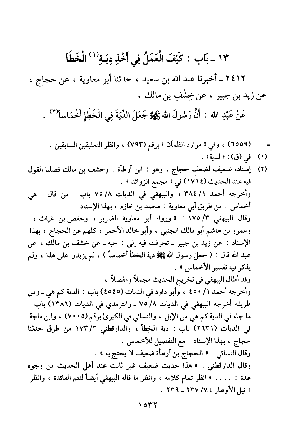 2412 - أَخْبَرَنَا عَبْدُ اللَّهِ بْنُ سَعِيدٍ، حَدَّثَنَا أَبُو مُعَاوِيَةَ، عَنْ حَجَّاجٍ، عَنْ زَيْدِ بْنِ جُبَيْرٍ، عَنْ خِشْفِ بْنِ مَالِكٍ، عَنْ عَبْدِ اللَّهِ، أَنَّ رَسُولَ اللَّهِ صَلَّى اللهُ عَلَيْهِ وَسَلَّمَ «§جَعَلَ الدِّيَةَ فِي الْخَطَإِ أَخْمَاسًا» Qإسناده ضعيف لضعف حجاج وهو: ابن أرطأة