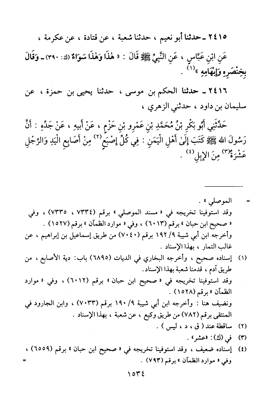 2416 - حَدَّثَنَا الْحَكَمُ بْنُ مُوسَى، حَدَّثَنَا يَحْيَى بْنُ حَمْزَةَ، عَنْ سُلَيْمَانَ بْنِ دَاوُدَ، حَدَّثَنِي الزُّهْرِيُّ، حَدَّثَنِي أَبُو بَكْرِ بْنُ مُحَمَّدِ بْنِ عَمْرِو بْنِ حَزْمٍ، عَنْ أَبِيهِ، عَنْ جَدِّهِ، أَنَّ رَسُولَ اللَّهِ صَلَّى اللهُ عَلَيْهِ وَسَلَّمَ كَتَبَ إِلَى أَهْلِ الْيَمَنِ «§وَفِي كُلِّ إِصْبَعٍ مِنْ أَصَابِعِ الْيَدِ، وَالرِّجْلِ عَشْرٌ مِنَ الْإِبِلِ» Qإسناده ضعيف