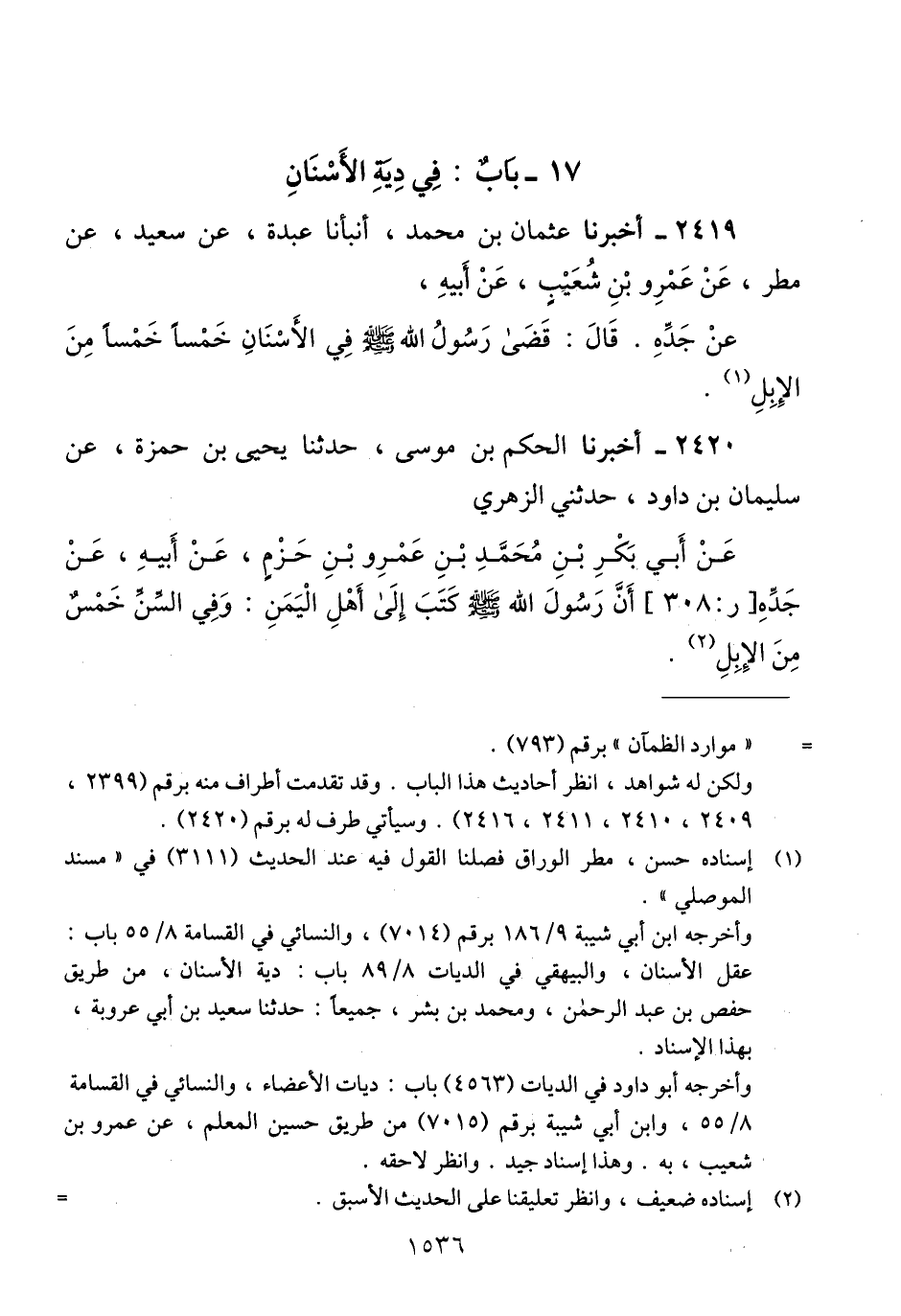 2419 - أَخْبَرَنَا عُثْمَانُ بْنُ مُحَمَّدٍ، أَنْبَأَنَا عَبْدَةُ، عَنْ سَعِيدٍ، عَنْ مَطَرٍ، عَنْ عَمْرِو بْنِ شُعَيْبٍ، عَنْ أَبِيهِ، عَنْ جَدِّهِ، قَالَ: «§قَضَى رَسُولُ اللَّهِ صَلَّى اللهُ عَلَيْهِ وَسَلَّمَ فِي الْأَسْنَانِ خَمْسًا خَمْسًا مِنَ الْإِبِلِ» Qإسناده حسن
