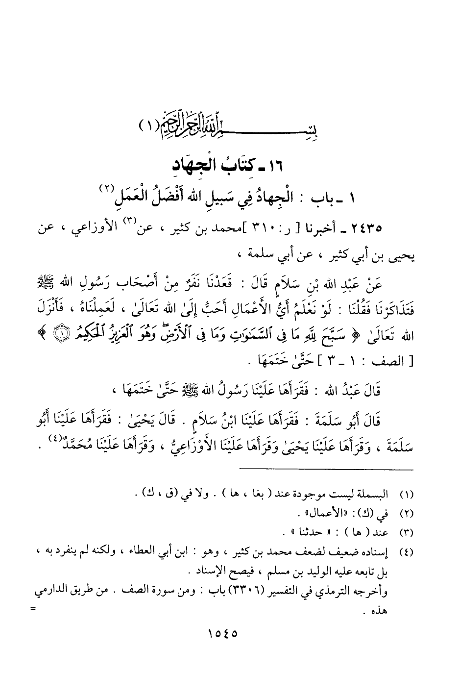 2435 - أَخْبَرَنَا مُحَمَّدُ بْنُ كَثِيرٍ، عَنْ الْأَوْزَاعِيِّ، عَنْ يَحْيَى بْنِ أَبِي كَثِيرٍ، عَنْ أَبِي سَلَمَةَ، عَنْ عَبْدِ اللَّهِ بْنِ سَلَامٍ، قَالَ: قَعَدْنَا نَفَرٌ مِنْ أَصْحَابِ رَسُولِ اللَّهِ صَلَّى اللهُ عَلَيْهِ وَسَلَّمَ فَتَذَاكَرْنَا فَقُلْنَا: §لَوْ نَعْلَمُ أَيَّ الْأَعْمَالِ أَحَبَّ إِلَى اللَّهِ تَعَالَى لَعَمِلْنَاهُ؟ فَأَنْزَلَ اللَّهُ تَعَالَى {«سَبَّحَ لِلَّهِ مَا فِي السَّماَوَاتِ وَمَا فِي الْأَرْضِ، وَهُوَ الْعَزِيزُ الْحَكِيمُ، يَا أَيُّهَا الَّذِينَ آمَنُوا لِمَ تَقُولُونَ مَا لَا تَفْعَلُونَ كَبُرَ مَقْتًا»} [الصف: 2] حَتَّى خَتَمَهَا، قَالَ عَبْدُ اللَّهِ: فَقَرَأَهَا عَلَيْنَا رَسُولُ اللَّهِ صَلَّى اللهُ عَلَيْهِ وَسَلَّمَ حَتَّى خَتَمَهَا، قَالَ أَبُو سَلَمَةَ: فَقَرَأَهَا عَلَيْنَا ابْنُ سَلَامٍ: قَالَ يَحْيَى: فَقَرَأَهَا عَلَيْنَا أَبُو سَلَمَةَ، وَقَرَأَهَا عَلَيْنَا يَحْيَى، وَقَرَأَهَا عَلَيْنَا الْأَوْزَاعِيُّ، وَقَرَأَهَا عَلَيْنَا مُحَمَّدٌQإسناده ضعيف لضعف محمد بن كثير وهو: ابن أبي العطاء ولكنه لم ينفرد به بل تابعه عليه الوليد بن مسلم فيصح الإسناد