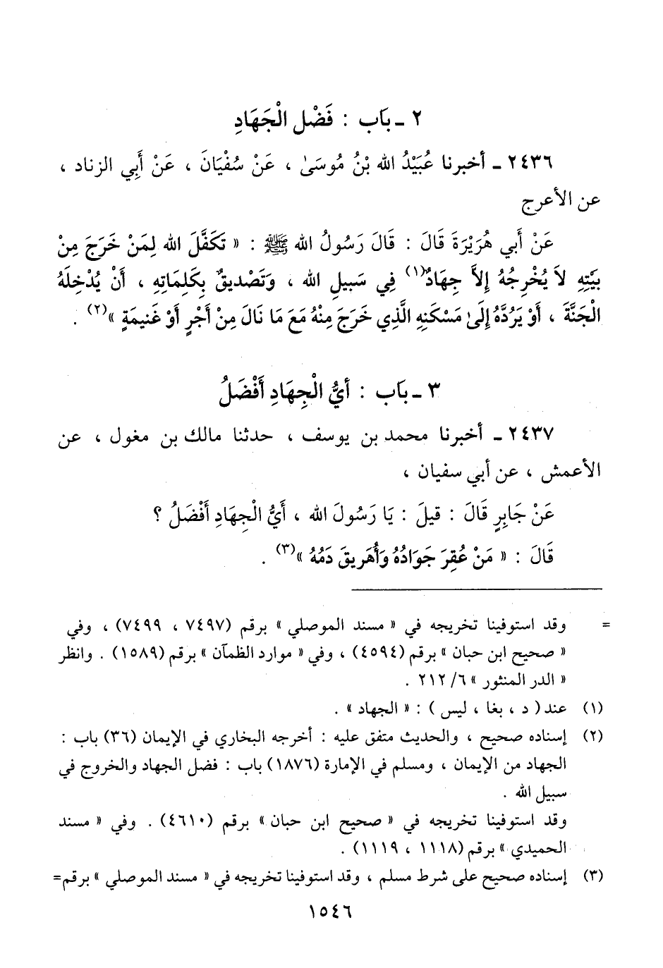 2437 - أَخْبَرَنَا مُحَمَّدُ بْنُ يُوسُفَ، حَدَّثَنَا مَالِكُ بْنُ مِغْوَلٍ، عَنْ الْأَعْمَشِ، عَنْ أَبِي سُفْيَانَ، عَنْ جَابِرٍ، قَالَ: قِيلَ: يَا رَسُولَ اللَّهِ §أَيُّ الْجِهَادِ أَفْضَلُ؟ قَالَ: «مَنْ عُقِرَ جَوَادُهُ، وَأُهْرِيقَ دَمُهُ» Qإسناده صحيح على شرط مسلم