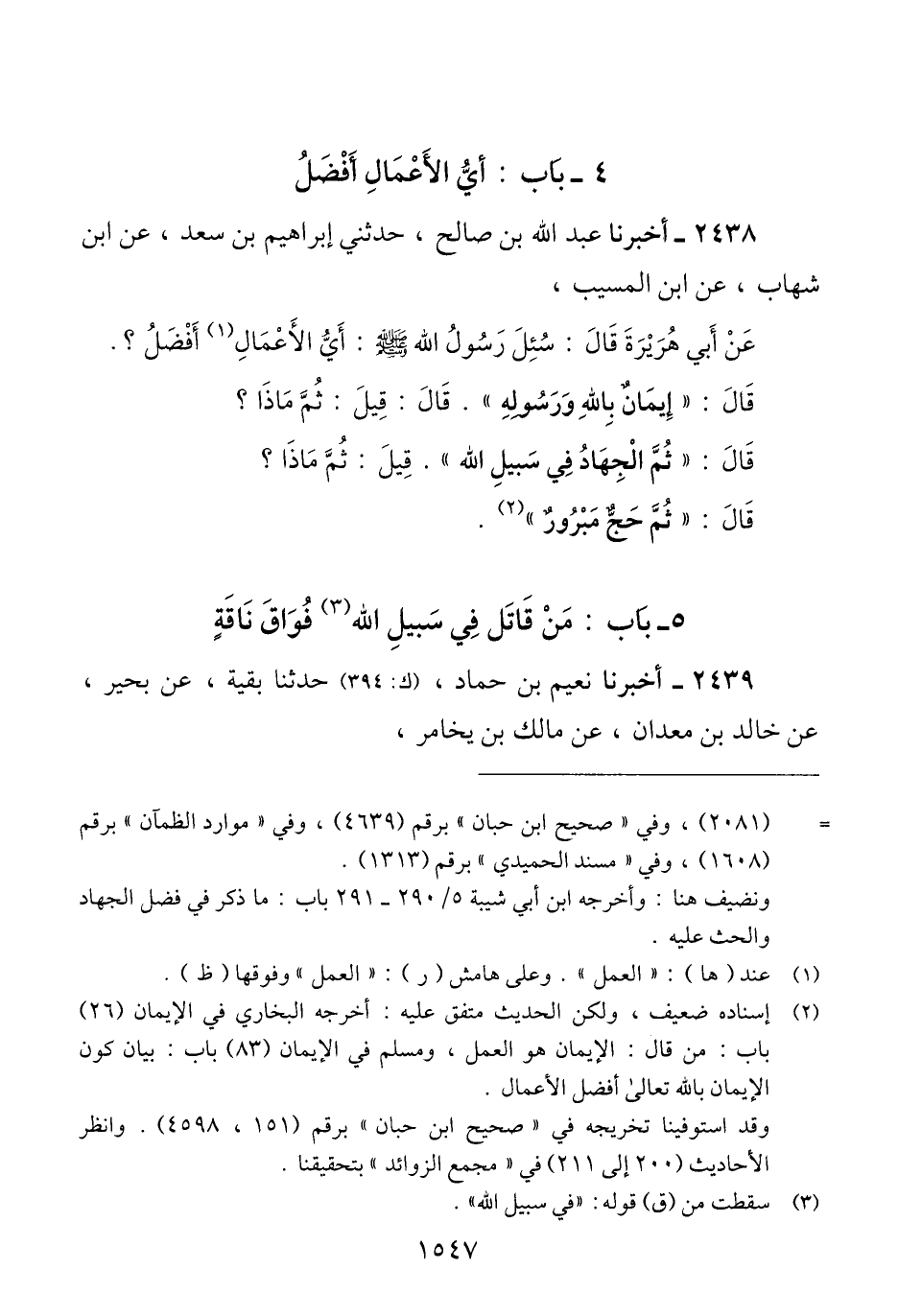 2438 - أَخْبَرَنَا عَبْدُ اللَّهِ بْنُ صَالِحٍ، حَدَّثَنِي إِبْرَاهِيمُ بْنُ سَعْدٍ، عَنْ ابْنِ شِهَابٍ، عَنْ ابْنِ الْمُسَيَّبِ، عَنْ أَبِي هُرَيْرَةَ، قَالَ: سُئِلَ رَسُولُ اللَّهِ صَلَّى اللهُ عَلَيْهِ وَسَلَّمَ §أَيُّ الْأَعْمَالِ أَفْضَلُ؟ قَالَ: «إِيمَانٌ بِاللَّهِ وَرَسُولِهِ» قَالَ: قِيلَ: ثُمَّ مَاذَا؟ قَالَ: «ثُمَّ الْجِهَادُ فِي سَبِيلِ اللَّهِ» قِيلَ: ثُمَّ مَاذَا؟ قَالَ: «ثُمَّ حَجٌّ مَبْرُورٌ» Qإسناده ضعيف ولكن الحديث متفق عليه