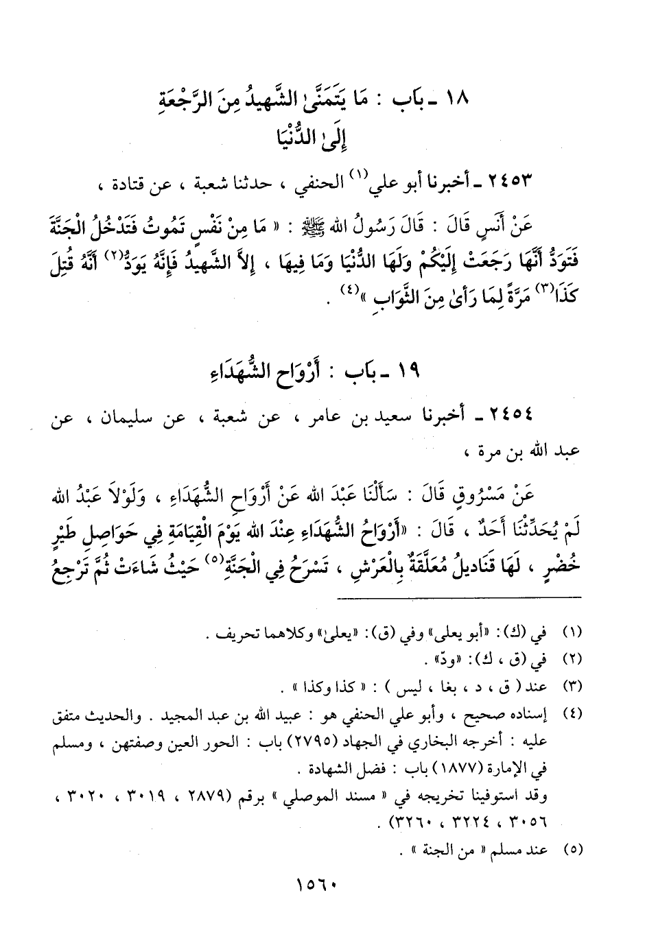 2454 - أَخْبَرَنَا سَعِيدُ بْنُ عَامِرٍ، عَنْ شُعْبَةَ، عَنْ سُلَيْمَانَ، عَنْ عَبْدِ اللَّهِ بْنِ مُرَّةَ، عَنْ مَسْرُوقٍ، قَالَ: سَأَلْنَا عَبْدَ اللَّهِ عَنْ أَرْوَاحُ الشُّهَدَاءِ، وَلَوْلَا عَبْدُ اللَّهِ، لَمْ يُحَدِّثْنَا أَحَدٌ، قَالَ: " §أَرْوَاحُ الشُّهَدَاءِ عِنْدَ اللَّهِ يَوْمَ الْقِيَامَةِ فِي حَوَاصِلِ طَيْرٍ خُضْرٍ، لَهَا قَنَادِيلُ مُعَلَّقَةٌ بِالْعَرْشِ، تَسْرَحُ فِي أَيِّ الْجَنَّةِ شَاءُوا، ثُمَّ تَرْجِعُ -[1561]- إِلَى قَنَادِيلِهَا فَيُشْرِفُ عَلَيْهِمْ رَبُّهُمْ فَيَقُولُ: أَلَكُمْ حَاجَةٌ؟ تُرِيدُونَ شَيْئًا؟ فَيَقُولُونَ: لَا، إِلَّا أَنْ نَرْجِعَ إِلَى الدُّنْيَا فَنُقْتَلَ مَرَّةً أُخْرَى "Qإسناده صحيح