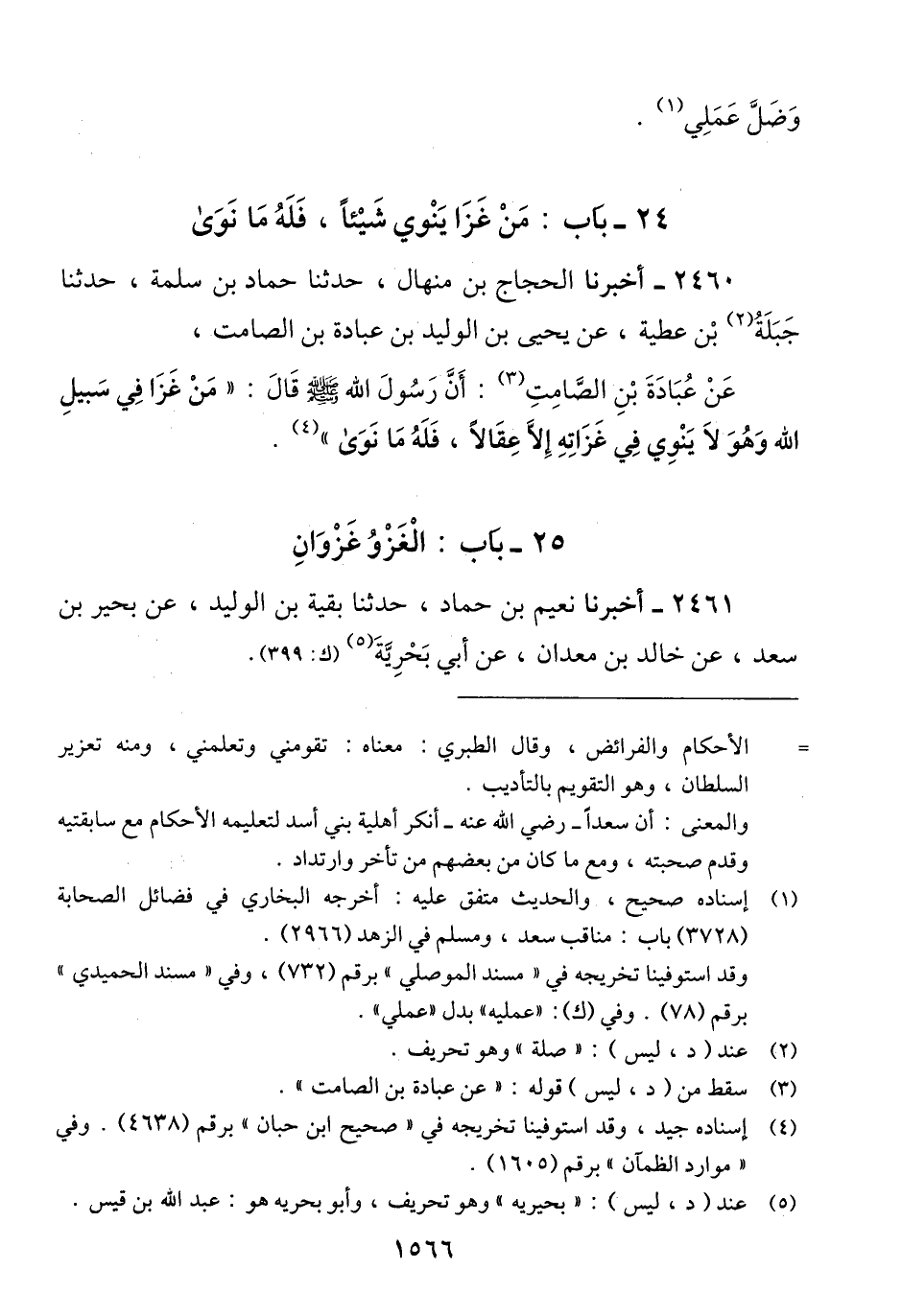 2460 - أَخْبَرَنَا الْحَجَّاجُ بْنُ مِنْهَالٍ، حَدَّثَنَا حَمَّادُ بْنُ سَلَمَةَ، حَدَّثَنَا جَبَلَةُ بْنُ عَطِيَّةَ، عَنْ يَحْيَى بْنِ الْوَلِيدِ بْنِ عُبَادَةَ بْنِ الصَّامِتِ، عَنْ عُبَادَةَ بْنِ الصَّامِتِ، أَنَّ رَسُولَ اللَّهِ صَلَّى اللهُ عَلَيْهِ وَسَلَّمَ قَالَ: «§مَنْ غَزَا فِي سَبِيلِ اللَّهِ، وَهُوَ لَا يَنْوِي فِي غَزَاتِهِ إِلَّا عِقَالًا فَلَهُ مَا نَوَى» Qإسناده جيد